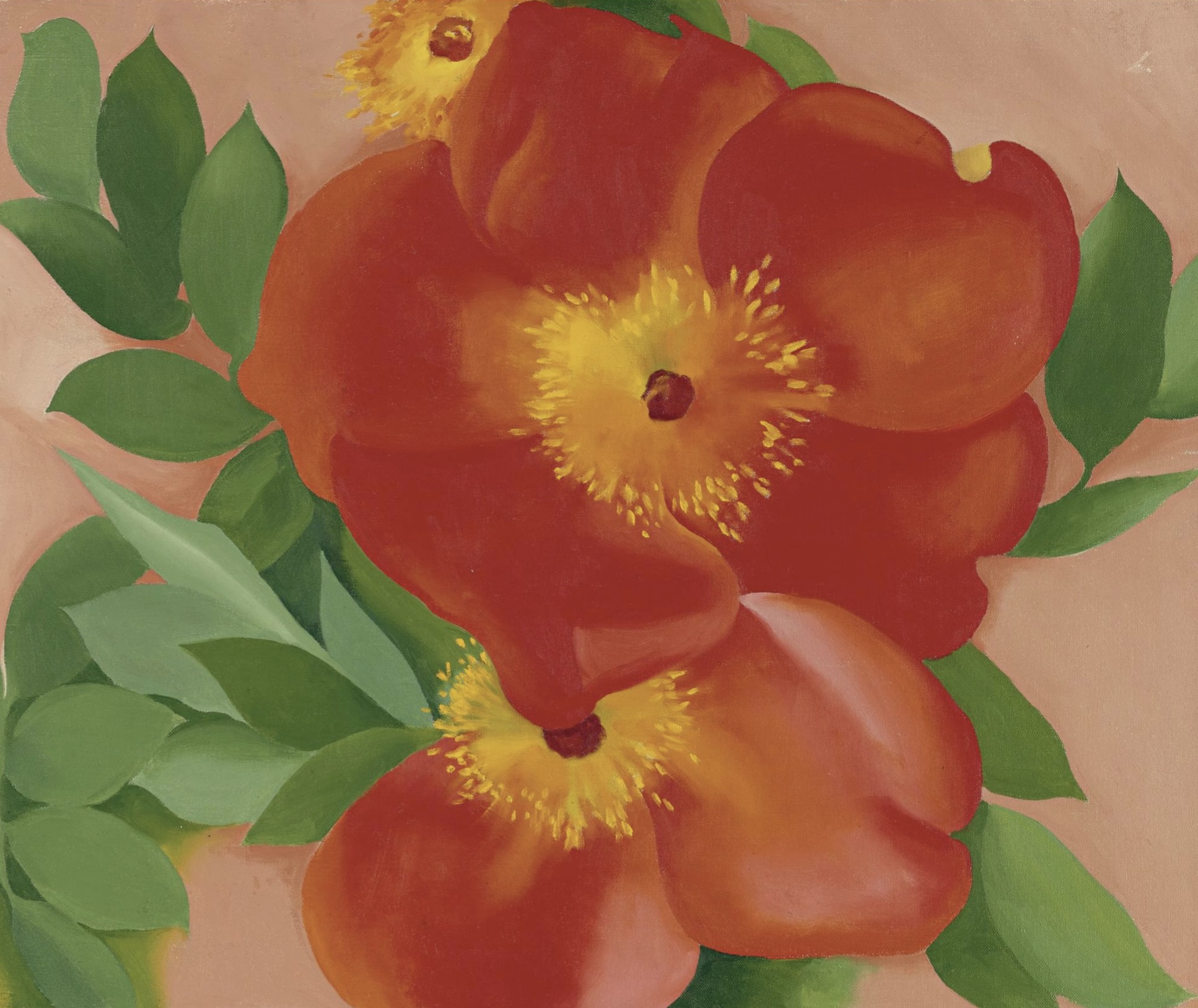 Georgia O’Keeffe, Two Austrian Copper Roses III, signed Georgia O’Keeffe on the reverse, oil on canvas laid down on board, 20 by 24 in., (50.8 by 61 cm), Painted in 1957, Image Source: Sotheby’s