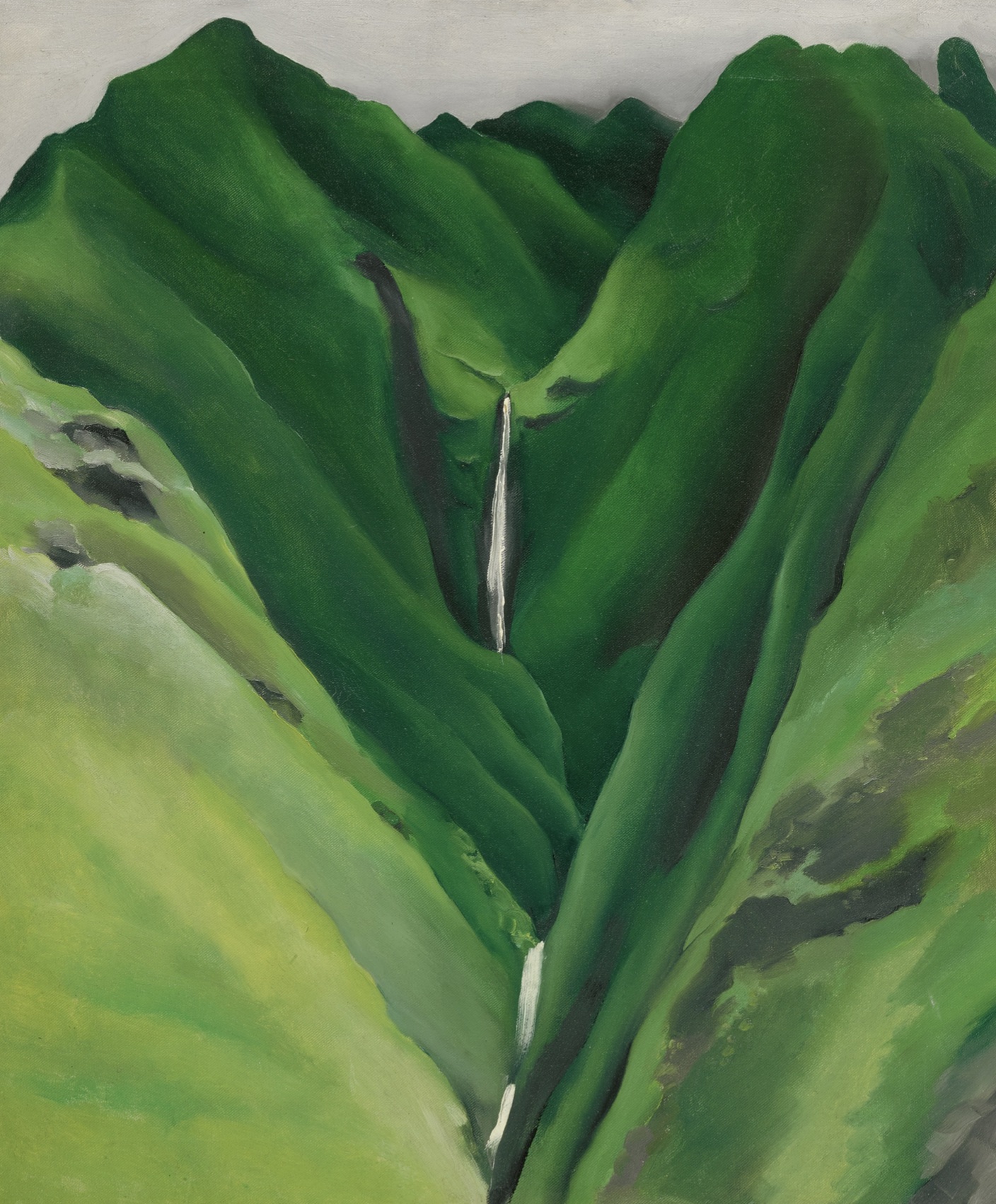“The present work is one of four images O’Keeffe painted of the spectacular waterfalls in the Īao Valley on Maui. Though her subject here is entirely unique within her celebrated oeuvre of natural scenery, the lens through which she interprets it evokes her profound, almost spiritual reaction to the landscape, the quality that pervades the entirety of her body of work. Here, O’Keeffe emphasizes the drama of the setting by allowing the powerful cliffs to dominate the composition. She eliminates the foreground entirely and includes only a small area of blue sky and clouds, implying that the viewer is closely positioned to these mountainous forms. O’Keeffe captures the fecundity of the Hawaiian landscape by applying passages of shades of verdant green to render her subject. Her crisply defined contours and careful modeling of forms create sculptural depth on the picture plane, while simultaneously her disregard for traditional scale and spatial depth contributes to a modern sense of flattened patterning. As such, the traditional landscape is transformed into an abstract design of organic lines and shapes.”