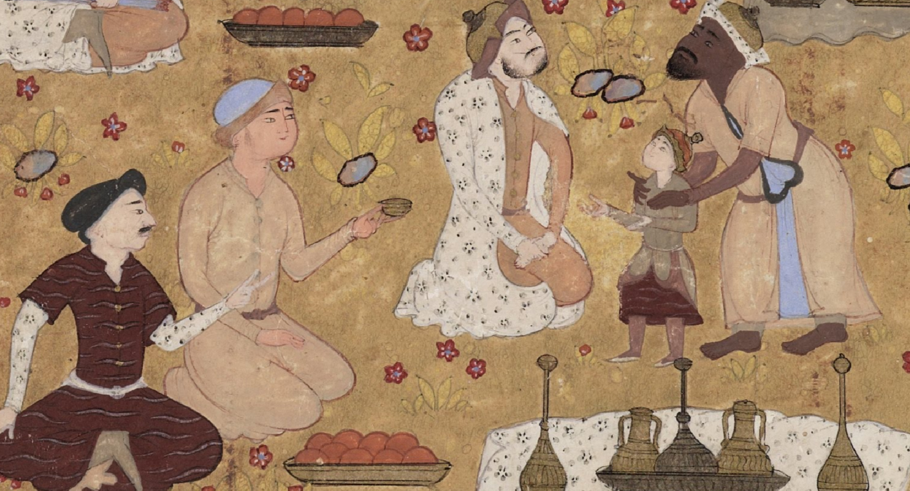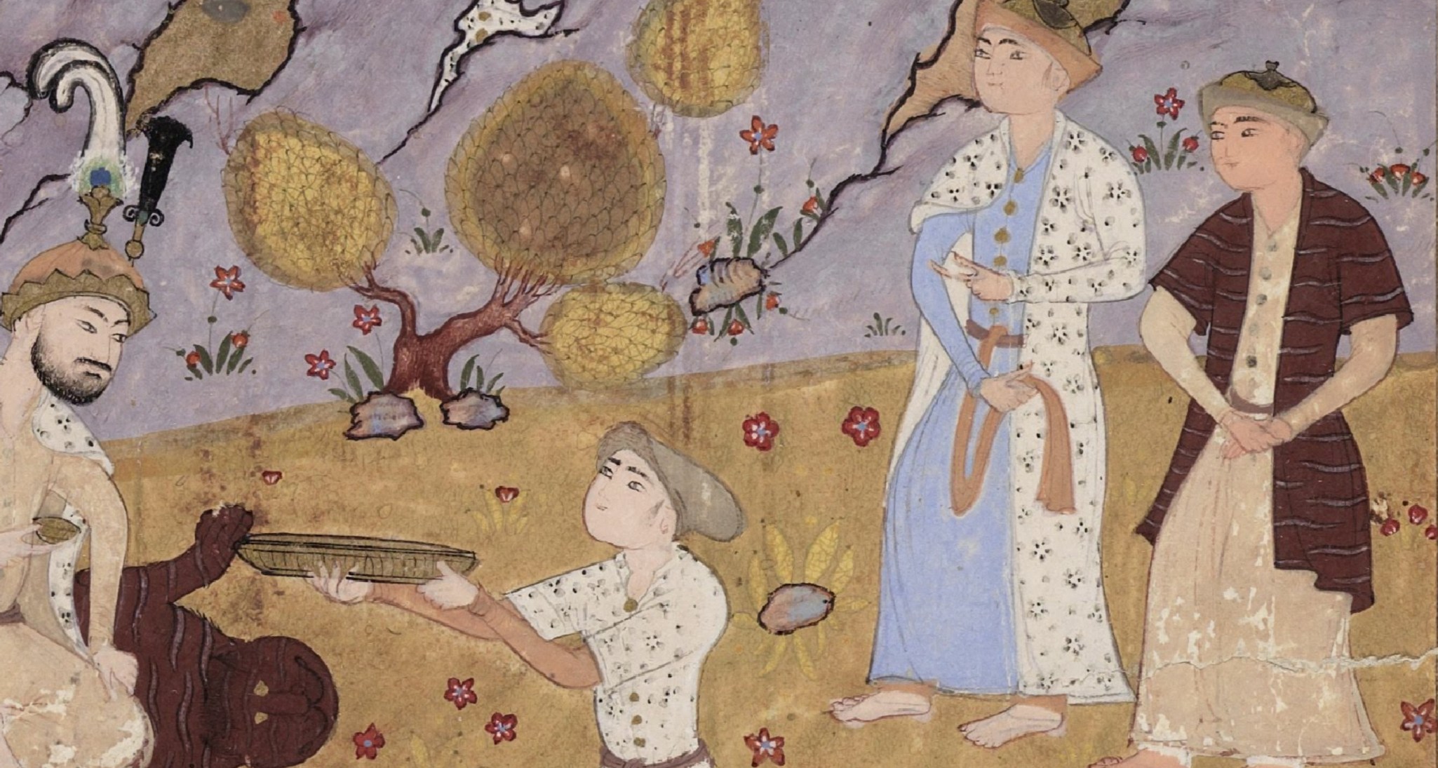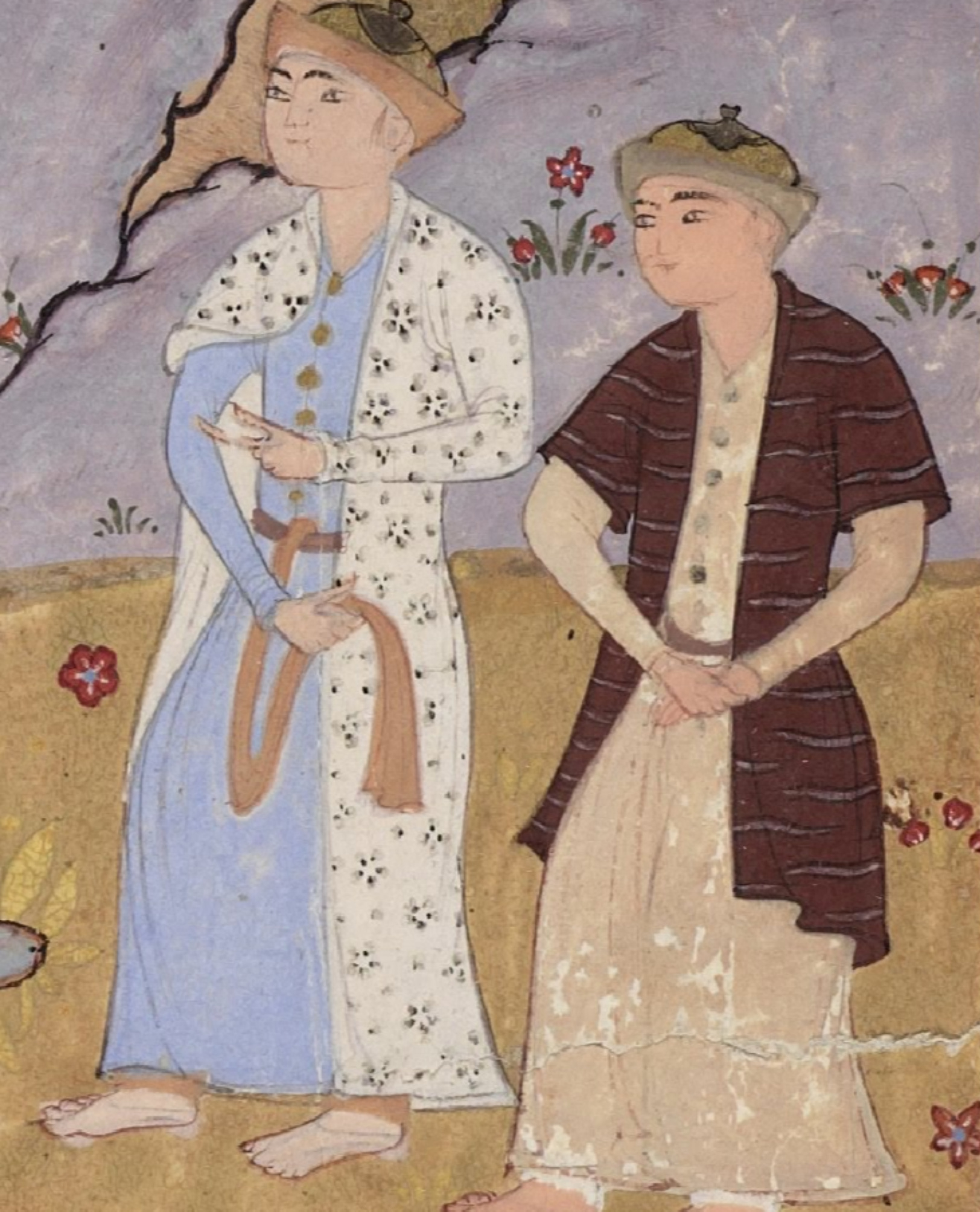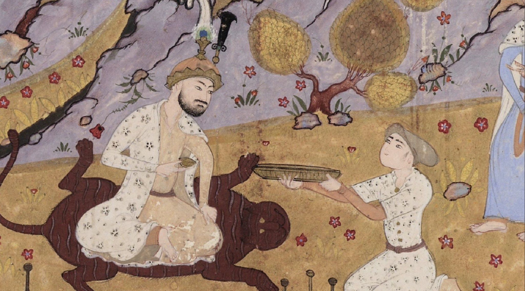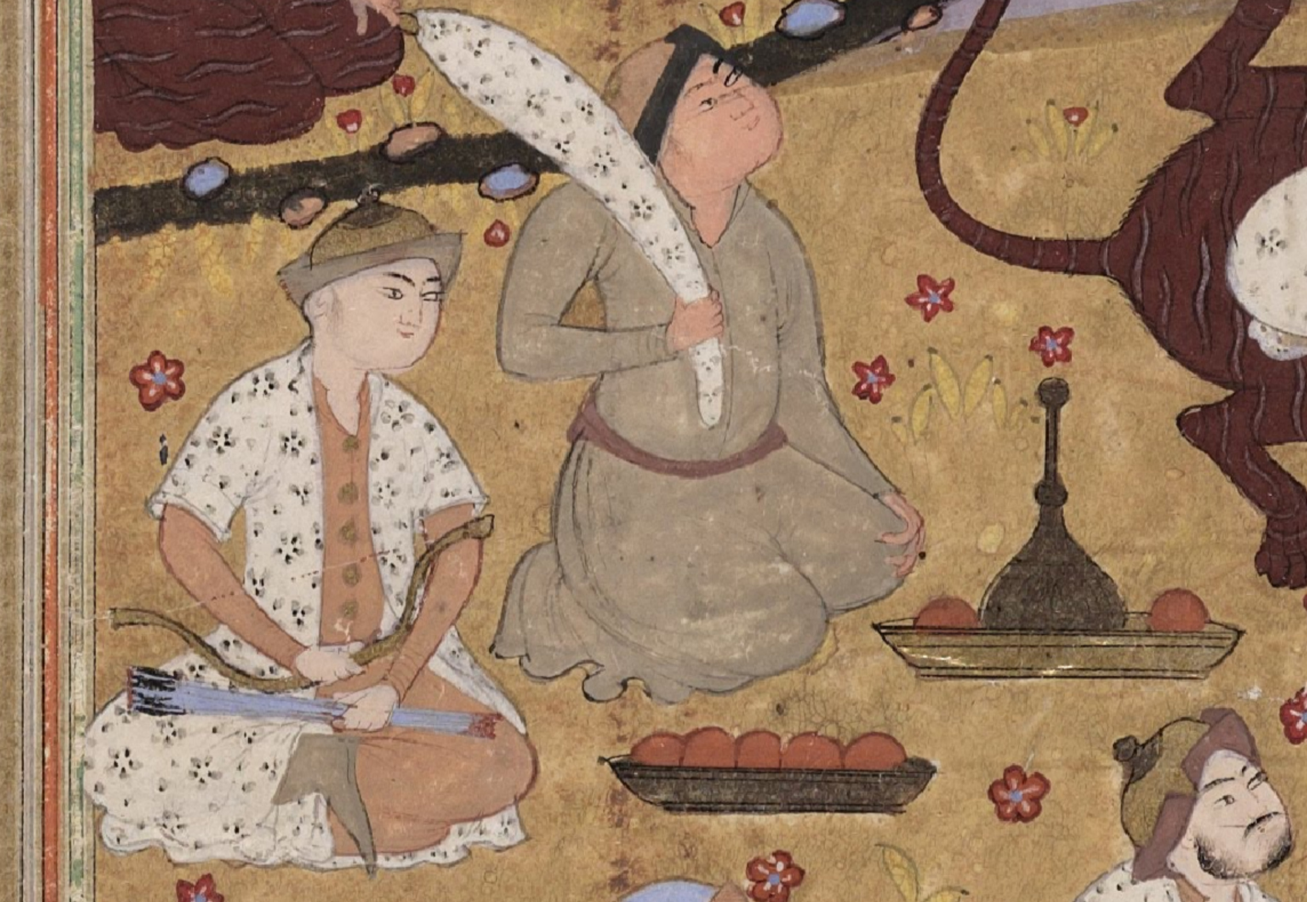 Gayumarth, the first king celebrated in the Persian epic, the Shahnameh, is shown holding court in the open, naming his young son as successor. Gayumarth taught his people how to make clothing from animal skins, which they are wearing.