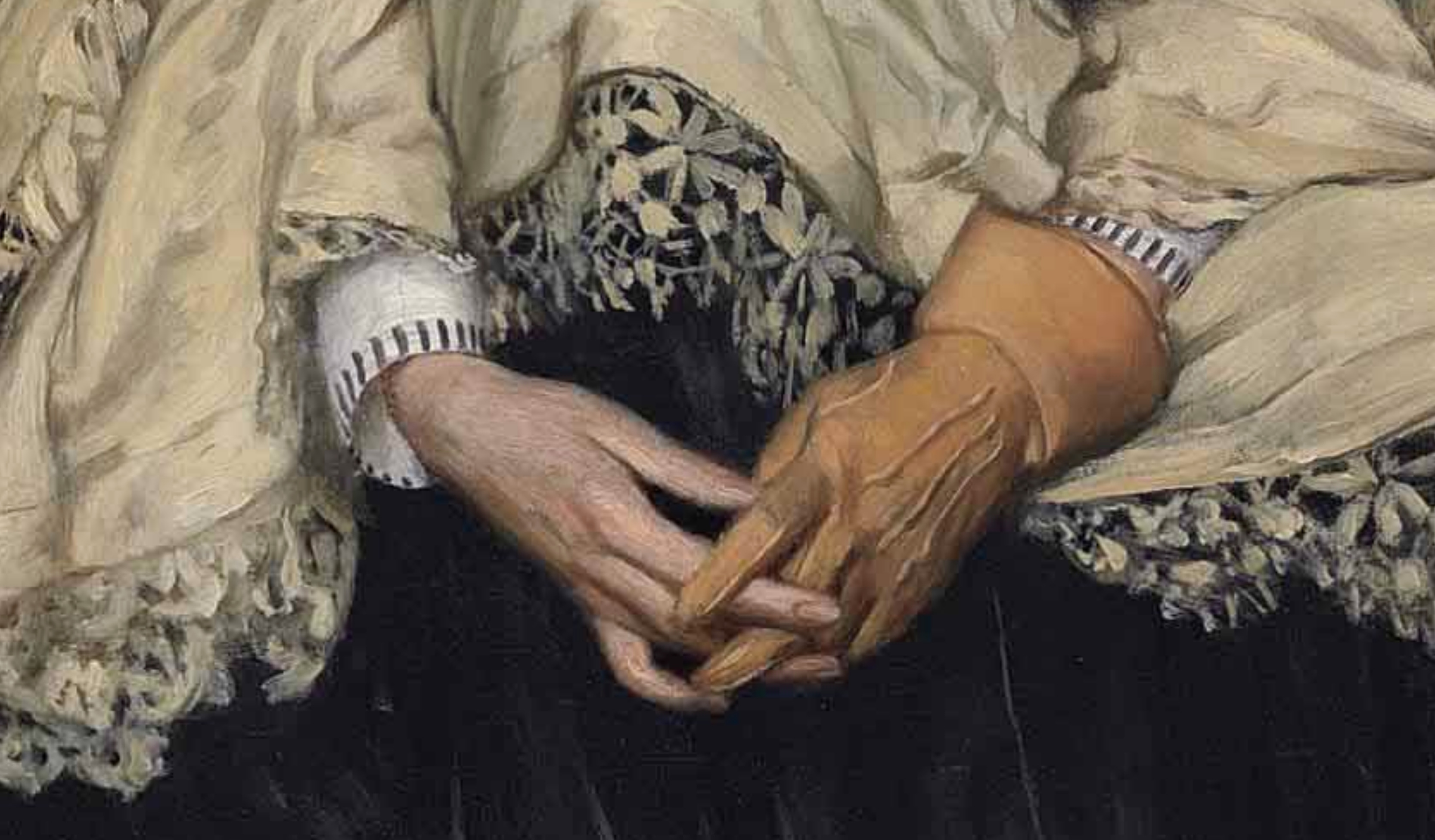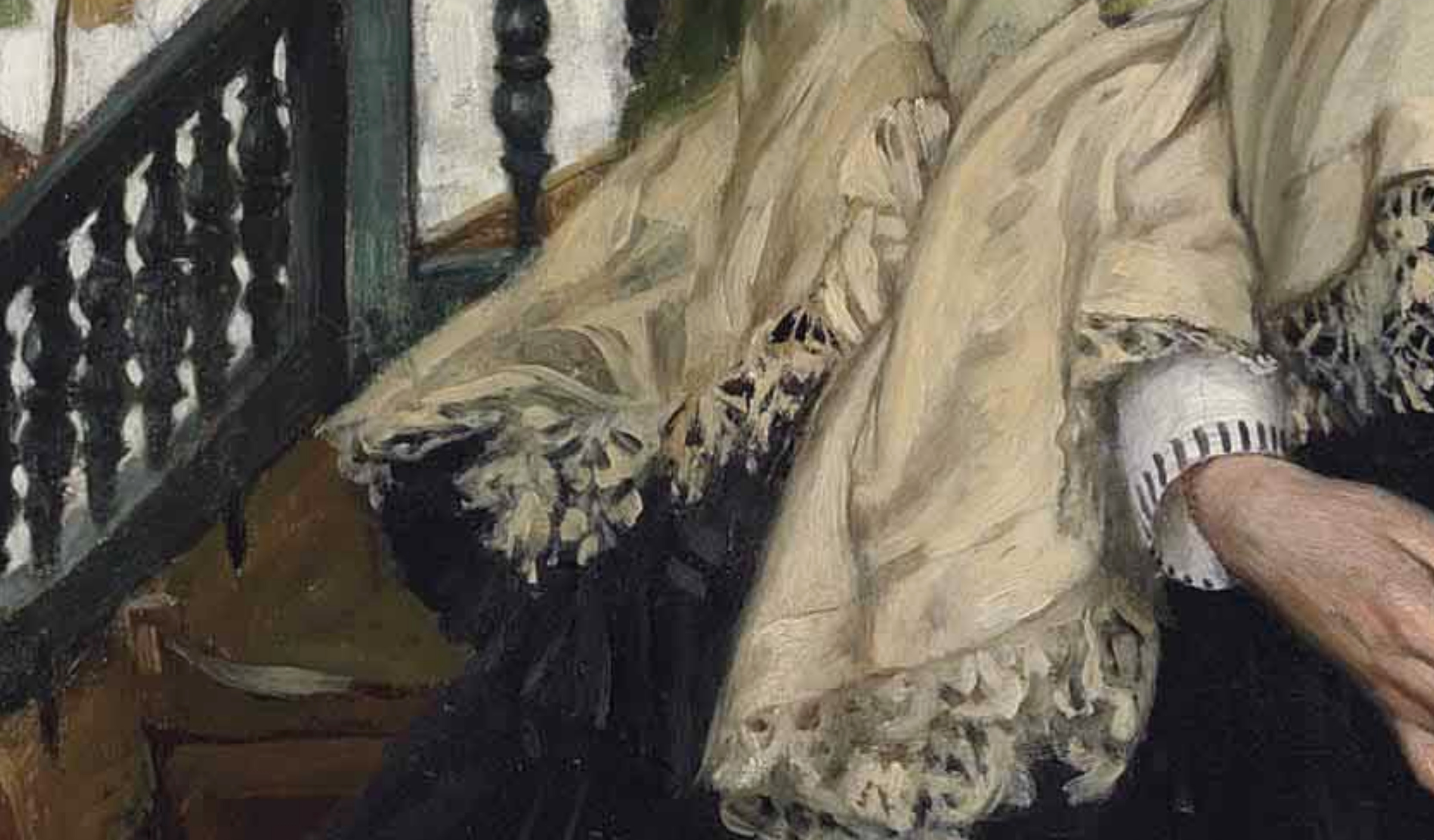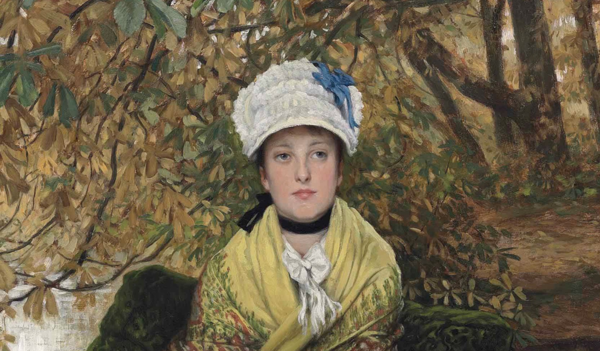 “‘Waiting’…demonstrates Tissot’s supreme skill as a painter in oils. The deft strokes and subtle colours of autumn leaves against shimmering water and filtered sunlight vie with Impressionist paintings, and the patch of water on the right, with reflected trees and floating leaves, is a painterly tour-de-force…Tissot is thought of principally as a painter of detail; his ability to convey costume and boating minutiae can mislead people into thinking he paints meticulously with a tiny brush, whereas in reality he paints with rapid, fluent, and often broad, touches. Angled lines of blacks and greys capture the pleats of the young woman’s skirt below her cream tunic, which is edged with matching flower-patterned lace that is painted in assured quick dabs, contrasting with the tunic’s undulating and jagged strokes. The single right glove is astounding: few painters could create such a believable rendition of fine leather empty of fingers and palm. READ FULL ESSAY: Christie’s