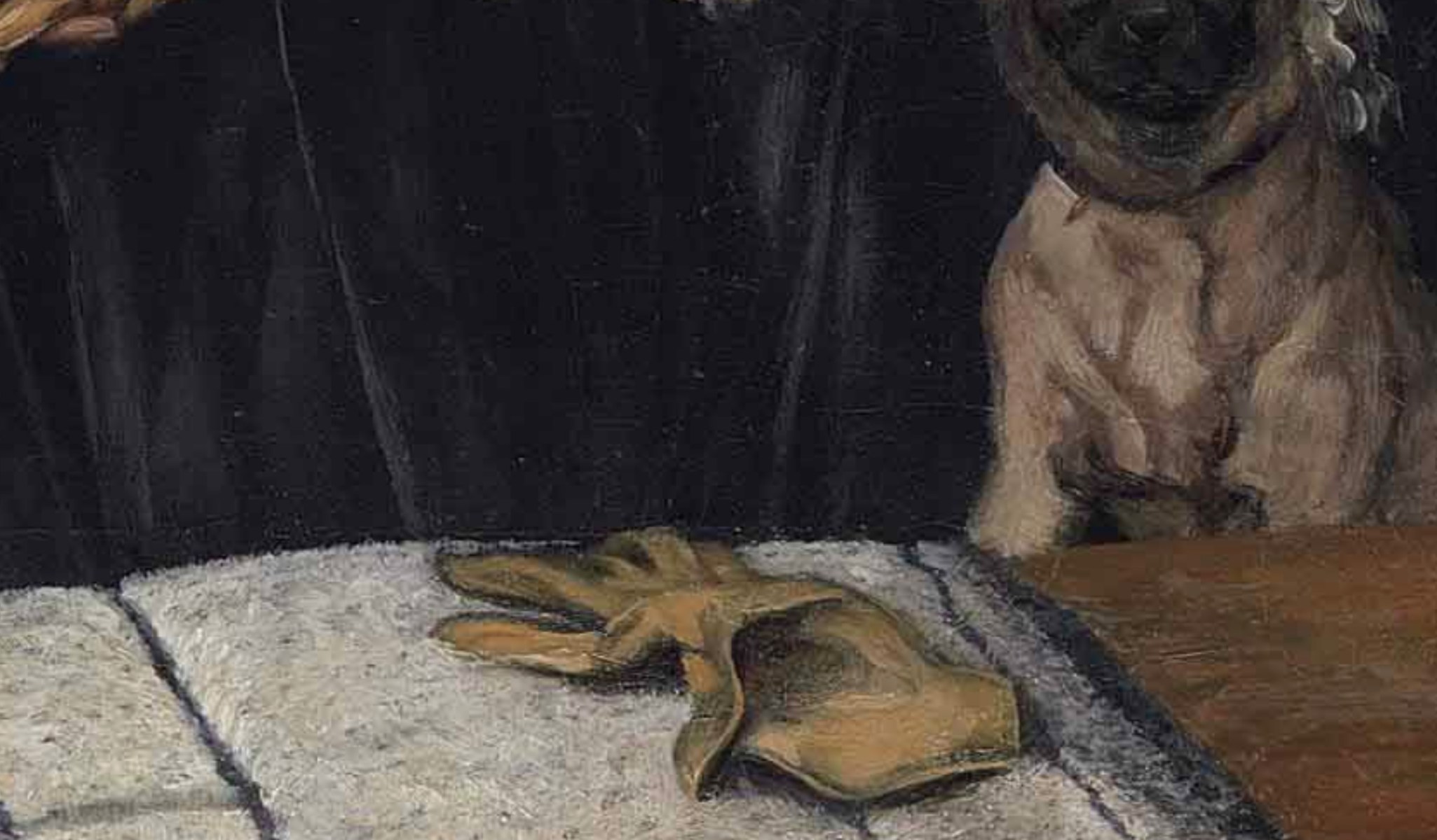 “She looks away and only the dog looks directly at the viewer. …One glove lies in front of her, while her right hand is both gloveless and ringless….The single right glove lies on the thwart and gapes open towards the right, on a blue-spotted and striped white towel.” Christie’s
