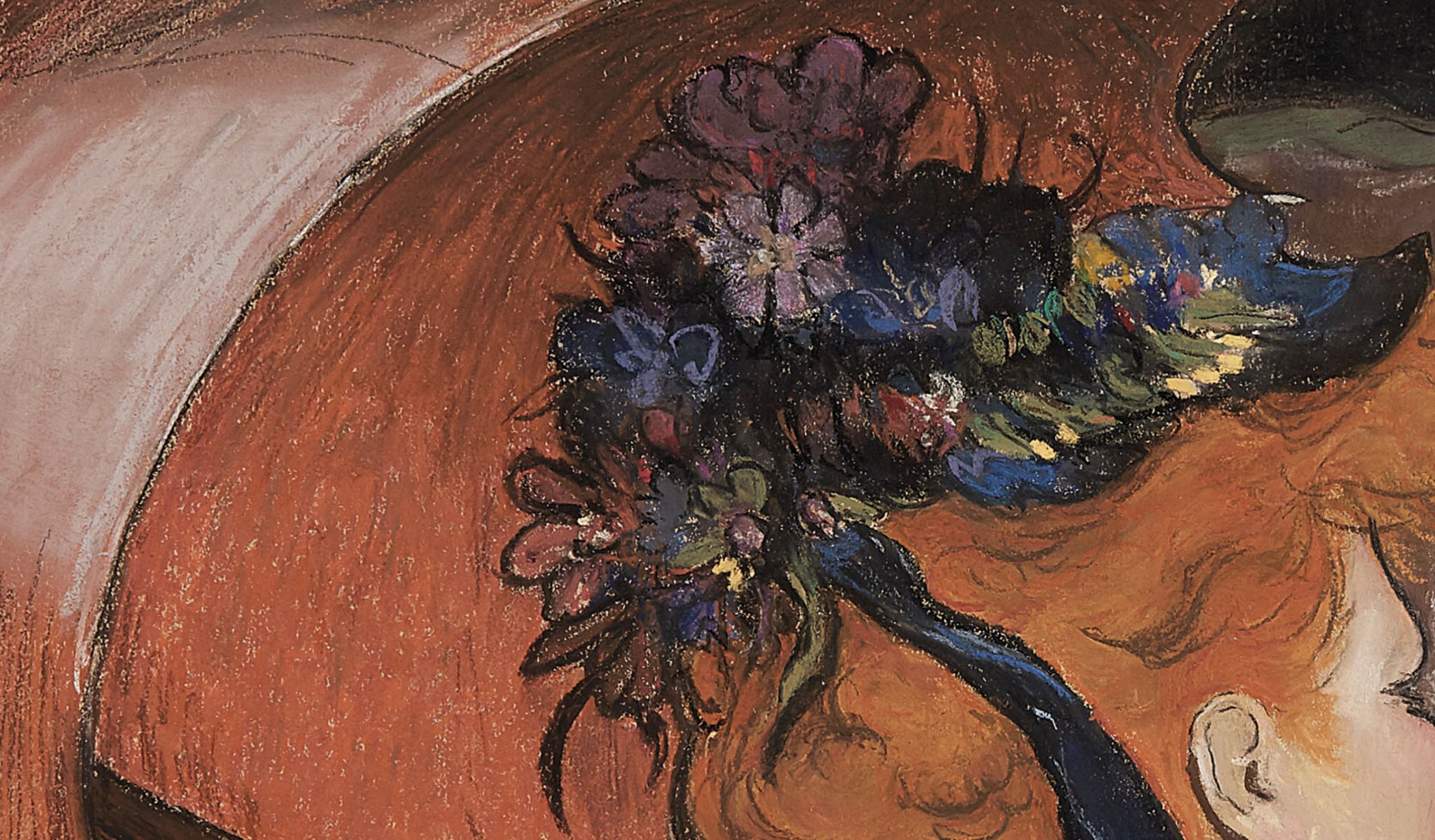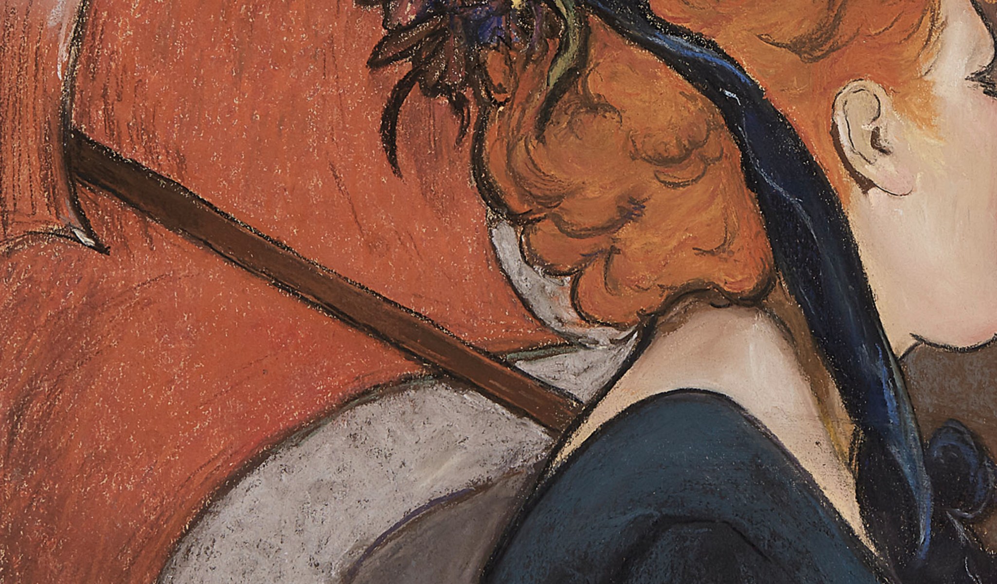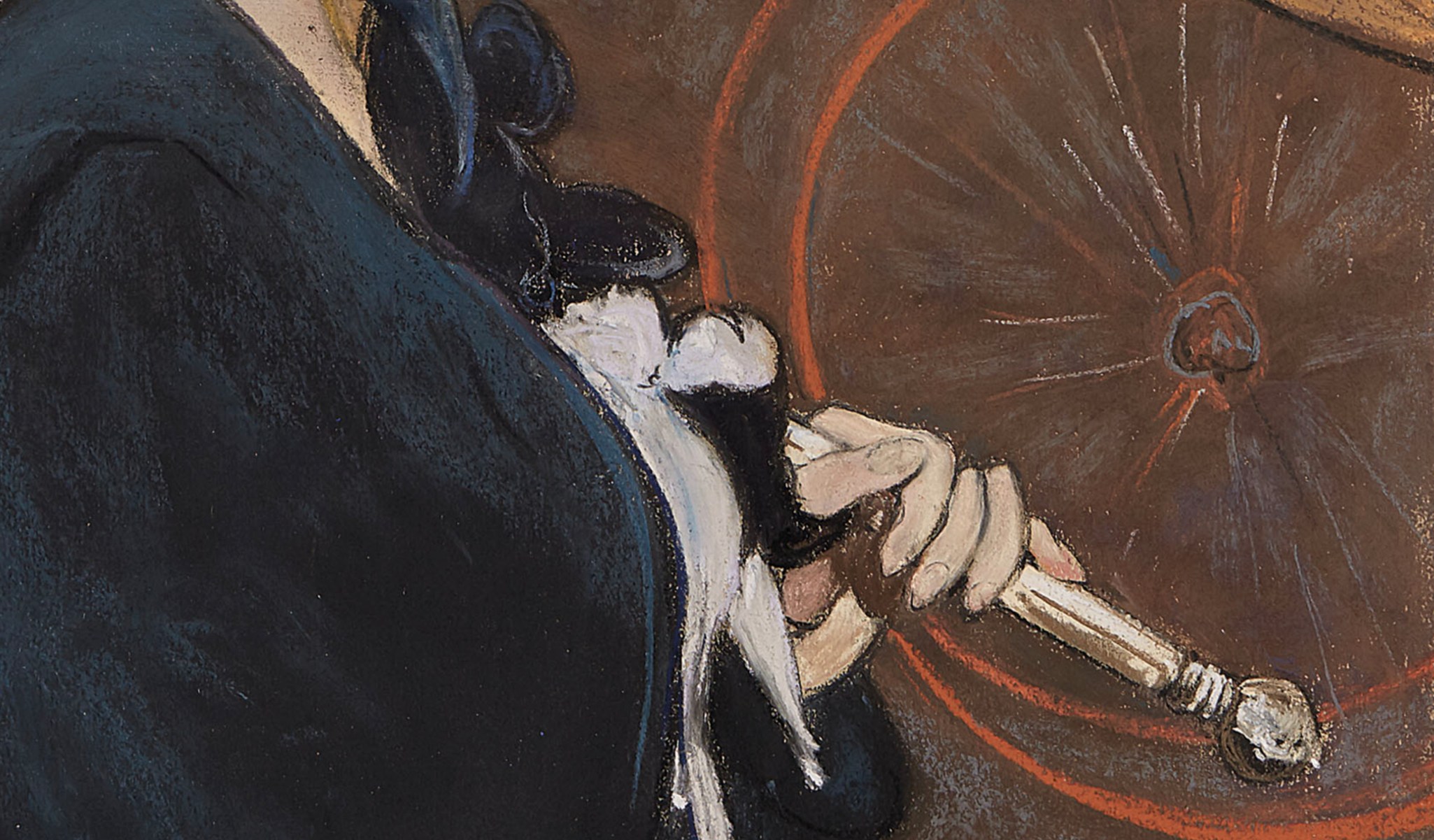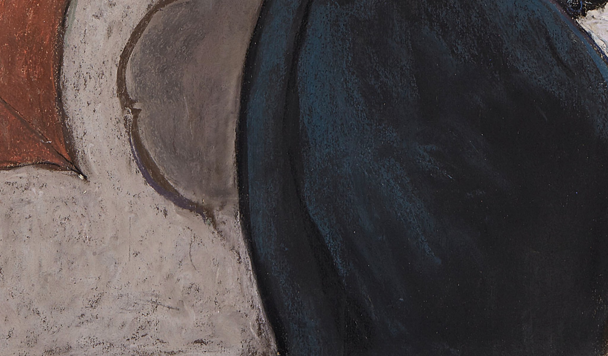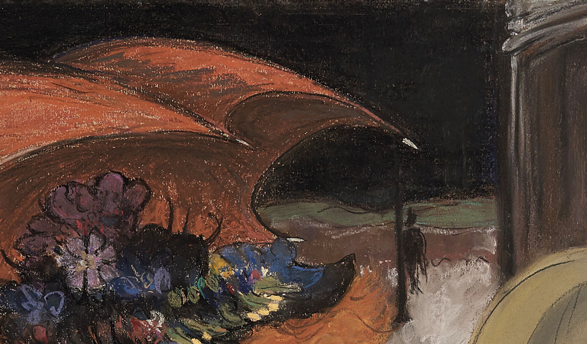 Anquetin drew Jeune femme à l’ombrelle during this landmark period in the development of Post-Impressionist modernism. This pastel may have been done in preparation for an oil painting executed in the same year. The artist’s subject is a stylish modern woman of the petit boulevard, taking an evening stroll. Anquetin composed this scene using a series of curved, circular and arching outlines, by which he described the forms of the ladies’ umbrellas, the carriage wheels, the bust and profile of the young woman and even the contour of the sidewalk. Clearly circumscribed and flat zones of colour comprise the overall nocturnal tonality of the picture, against which the artist has spotlighted smaller areas of more detailed treatment, as in the woman’s hat, the decoration on the front of her dress, her hands, and the umbrella handle.
