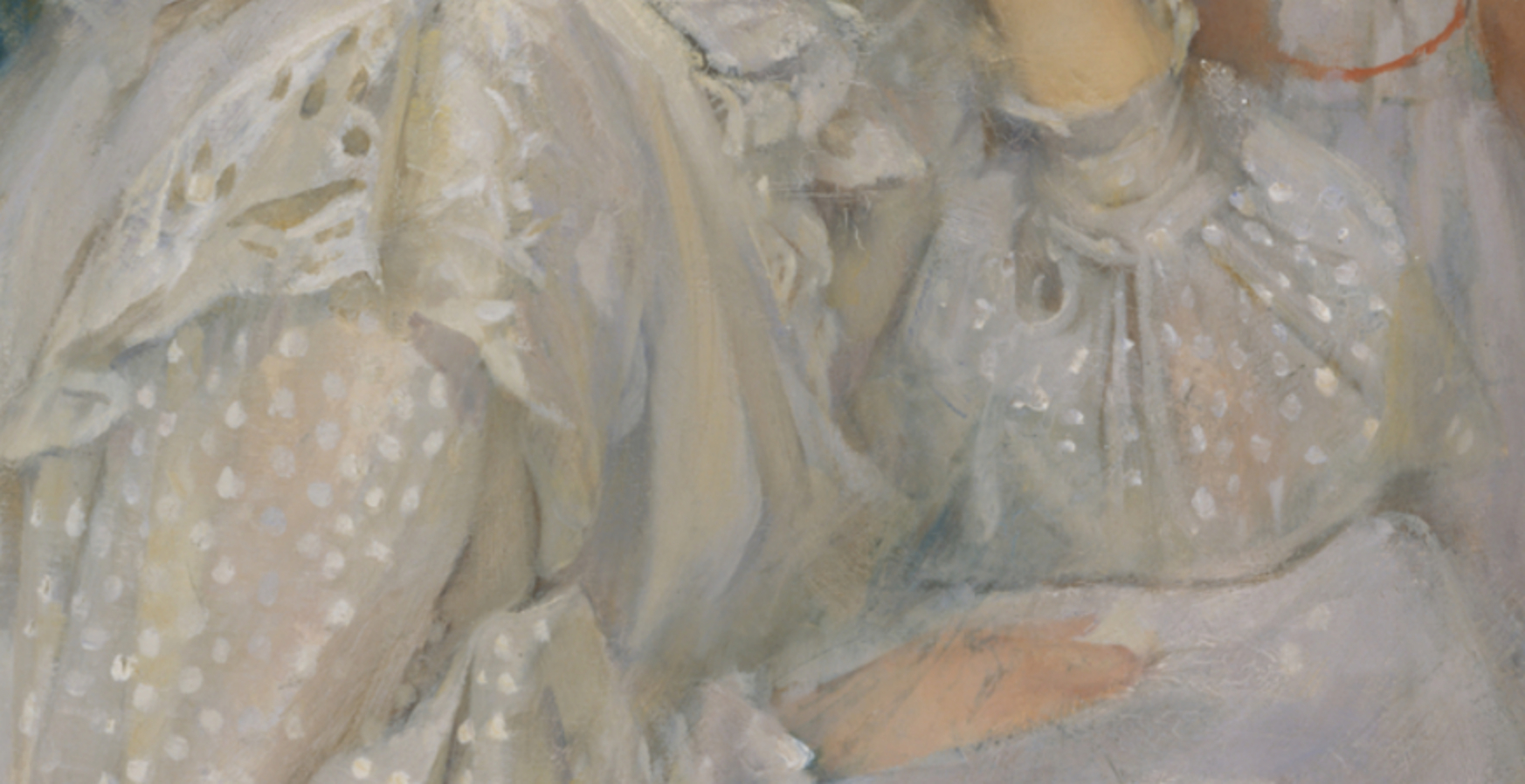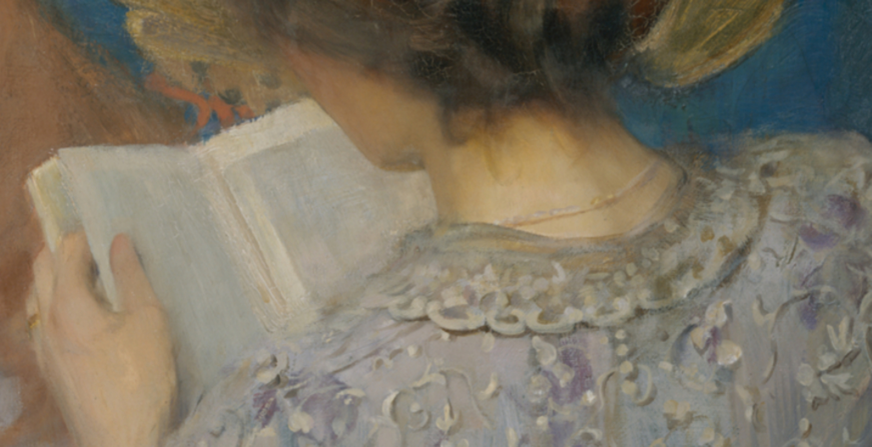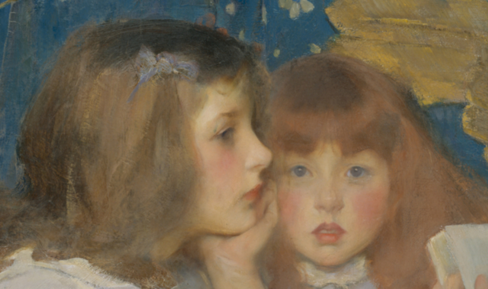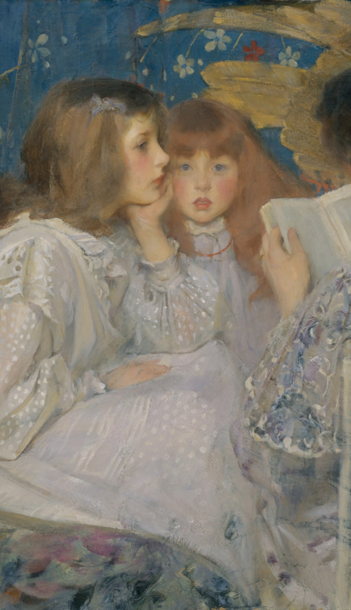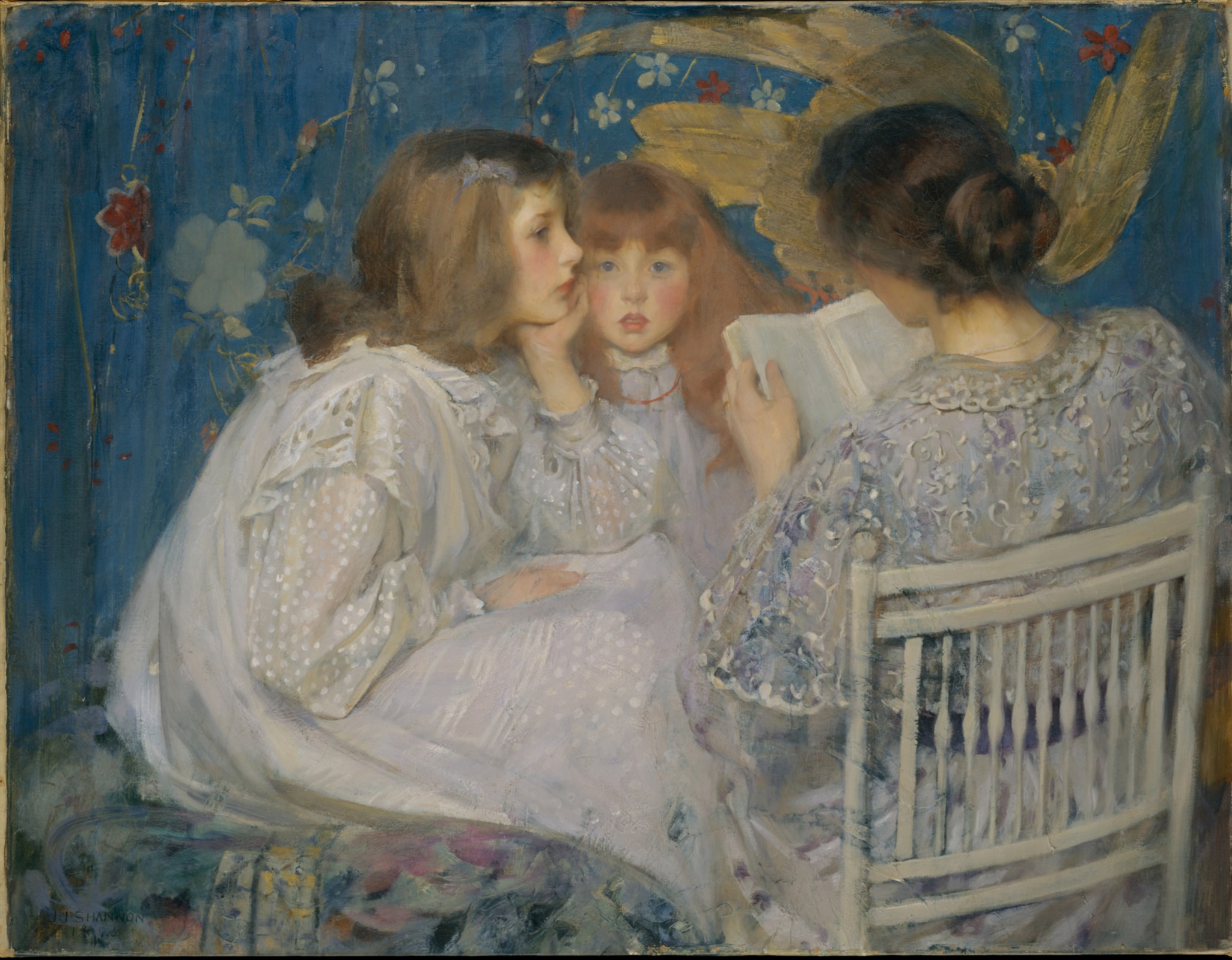 “Jungle Tales” portrays the artist’s wife reading to their daughter, Kitty, shown in profile, and another child. The painting’s title and date and its London origin suggest that the little group is captivated by Rudyard Kipling’s Jungle Book, which had appeared in 1894.
