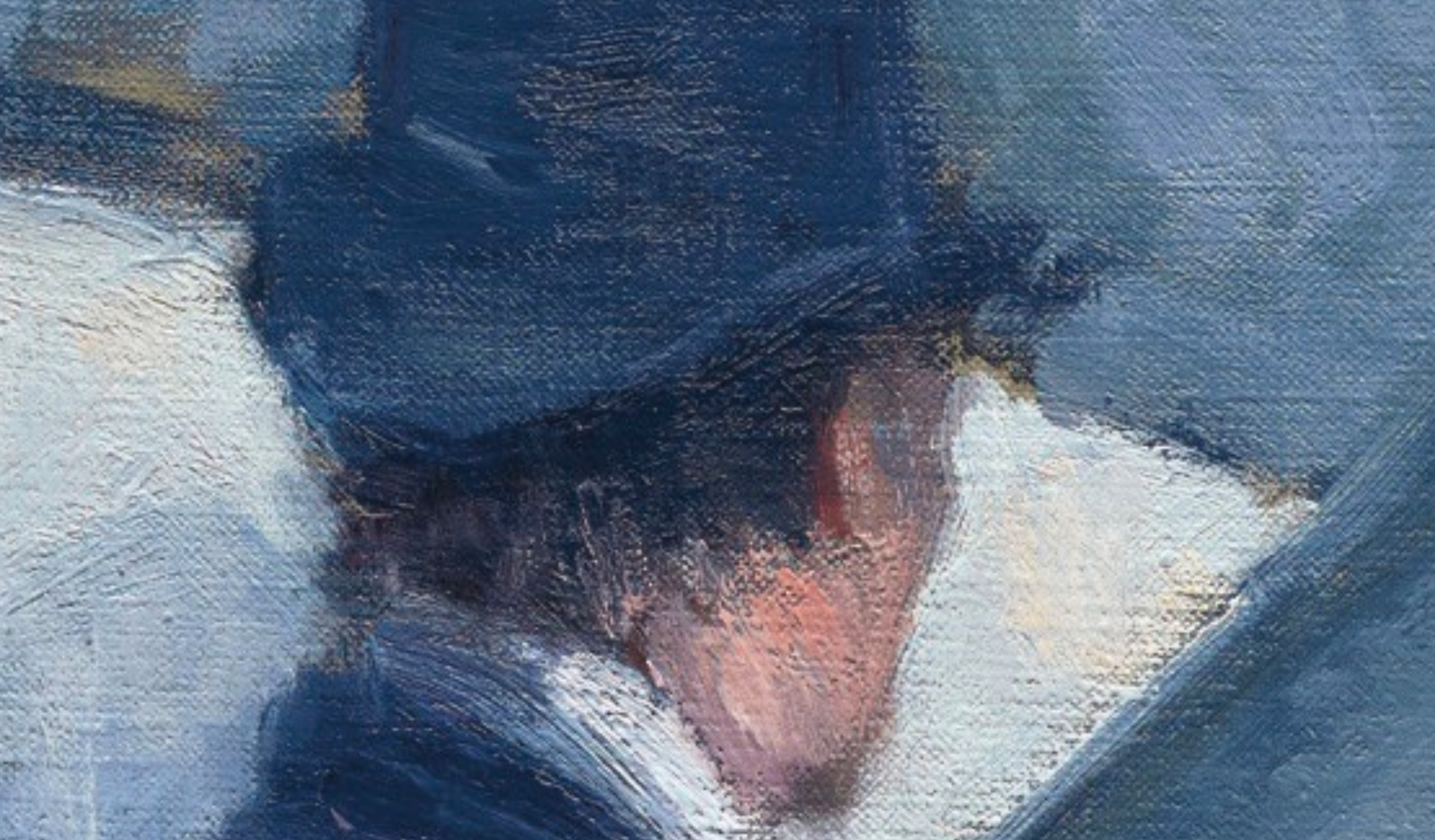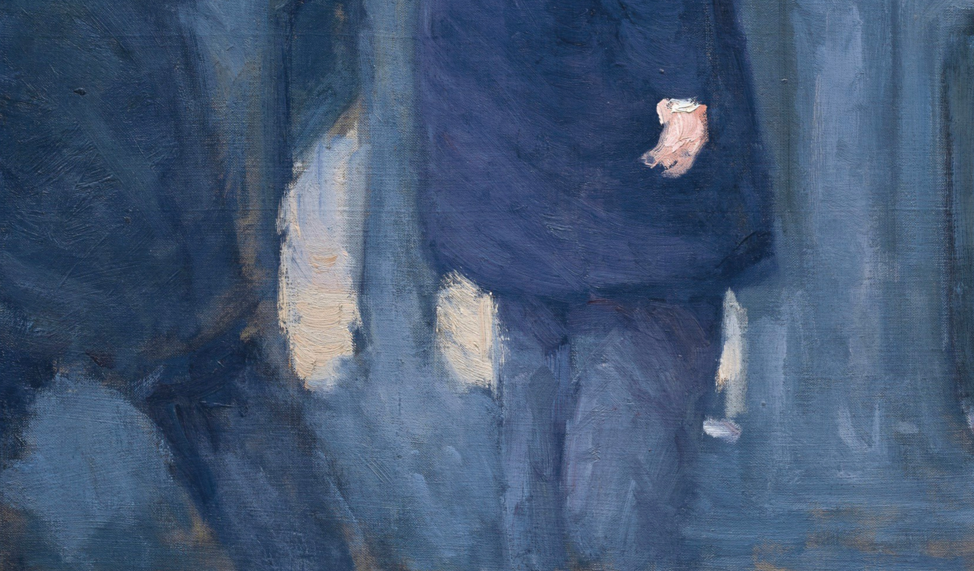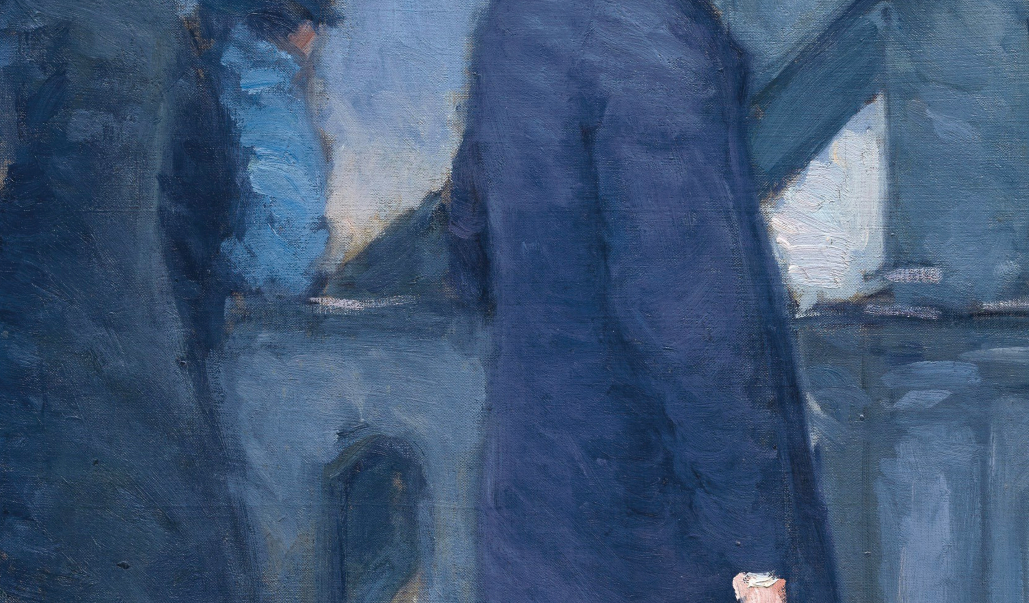 The two central figures in the present composition differ in class but share a view of modern Paris at work, emblematic of the way that industrialization blurred long-standing patterns of association. The man in the blue smock wears a stylish bowler that implies a certain upward mobility, suggesting that he is both a laborer and a businessman, maybe a shopkeeper. The top-hatted man, in contrast, is a true bourgeois, with grey frock coat and gloved hands.