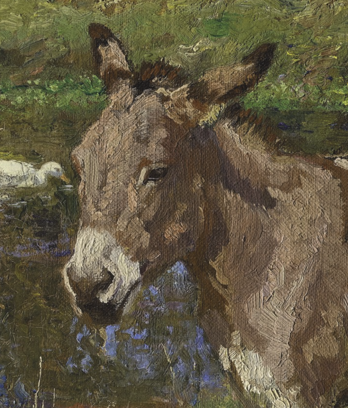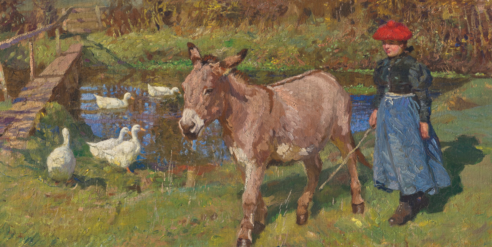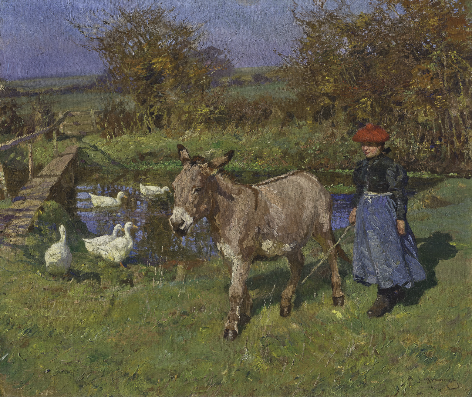Crostwick Common: Woman with a Donkey and Geese was executed in 1904, when Munnings stayed at an inn called the Crostwick White Horse, near Norwich, and painted at Crostwick Common. In his memoir An Artist’s Life, published nearly fifty years after the picture was completed, Munnings recalled those charmed days:
