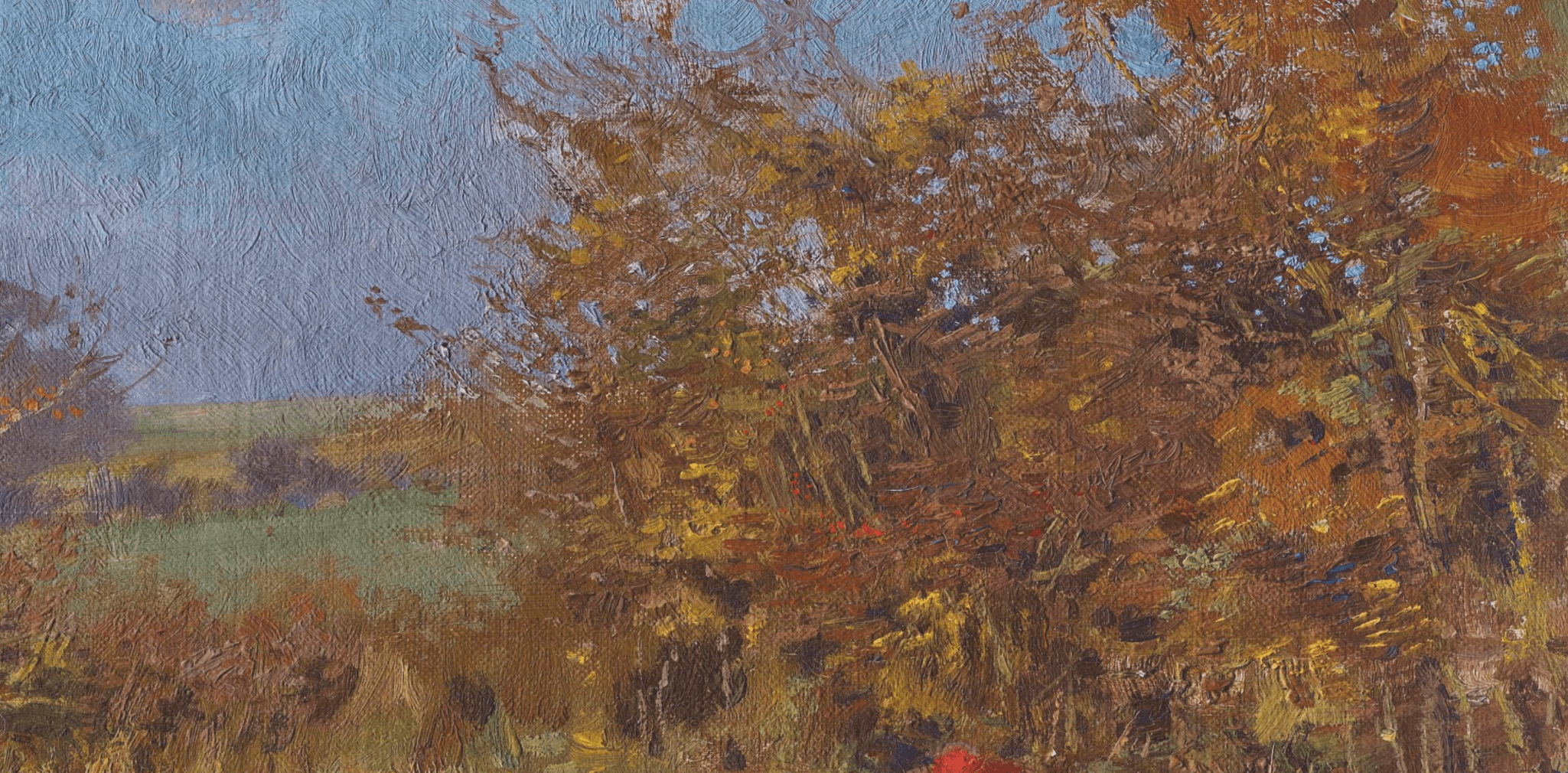 ‘Then came the open Common. There were the donkeys, young and old, a coloured cow or two, a white horse peacefully standing on a knoll – the wind stirring its tail – and geese and ponies. What a Common! … calm, grey autumn days followed in succession in that particular year; days with soft “barred clouds” stretching across the sky. I see the bramble patches, the dark clumps of gorse and purple torns and yellow bracken, the donkeys with their white muzzles, feeding, and the geese far away near the stream at the end. Here I was in my twenties, with everything around me to paint’ (A.J. Munnings, An Artist’s Life, London, 1950, pp. 204-5).