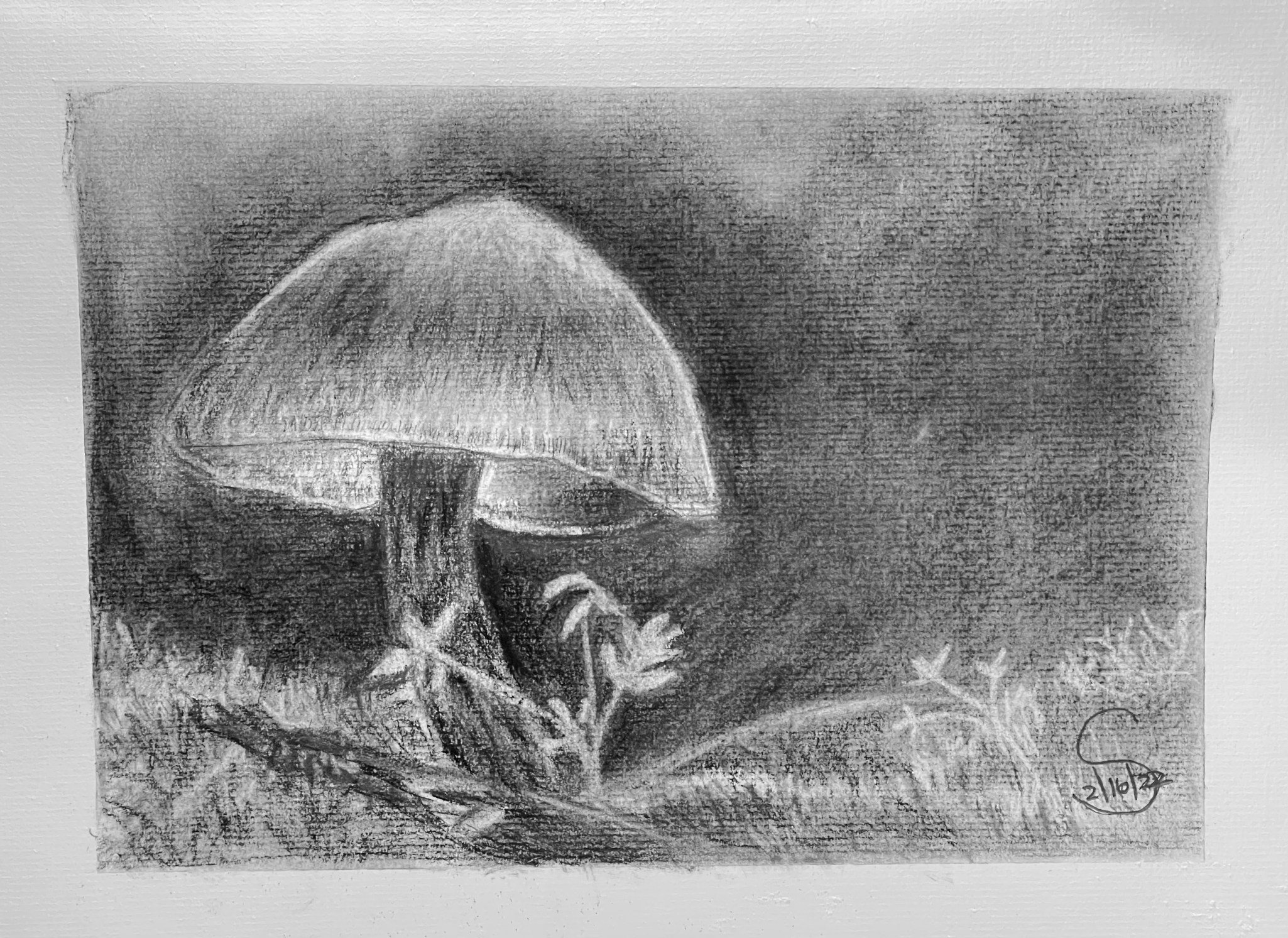 Moody Mushroom, by Sunnyside, charcoal on white paper, February 16, 2022
