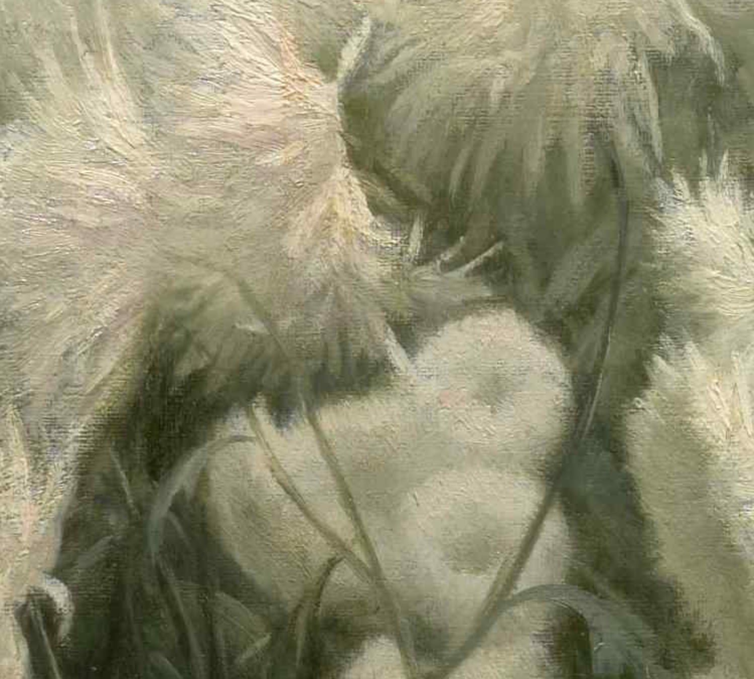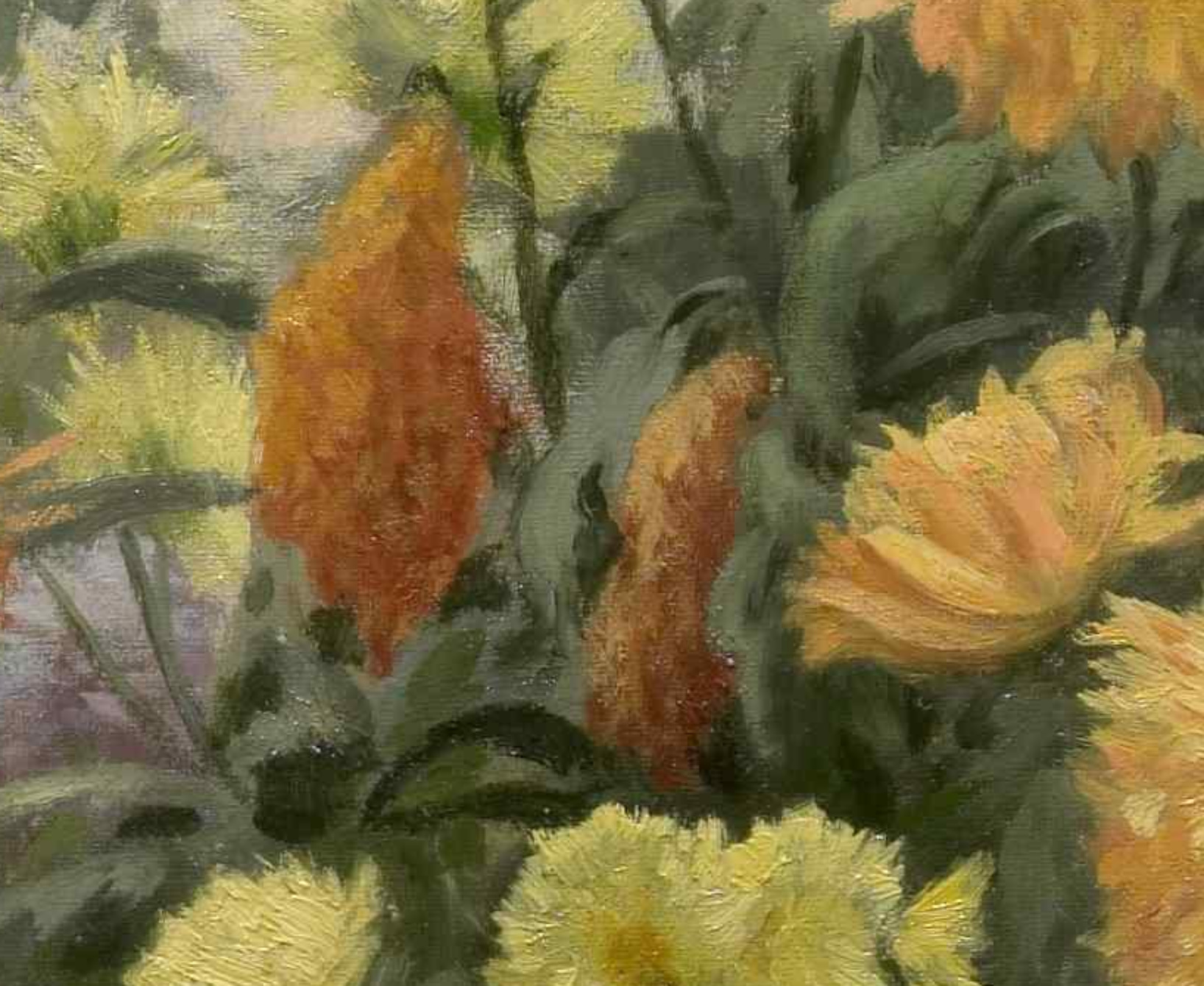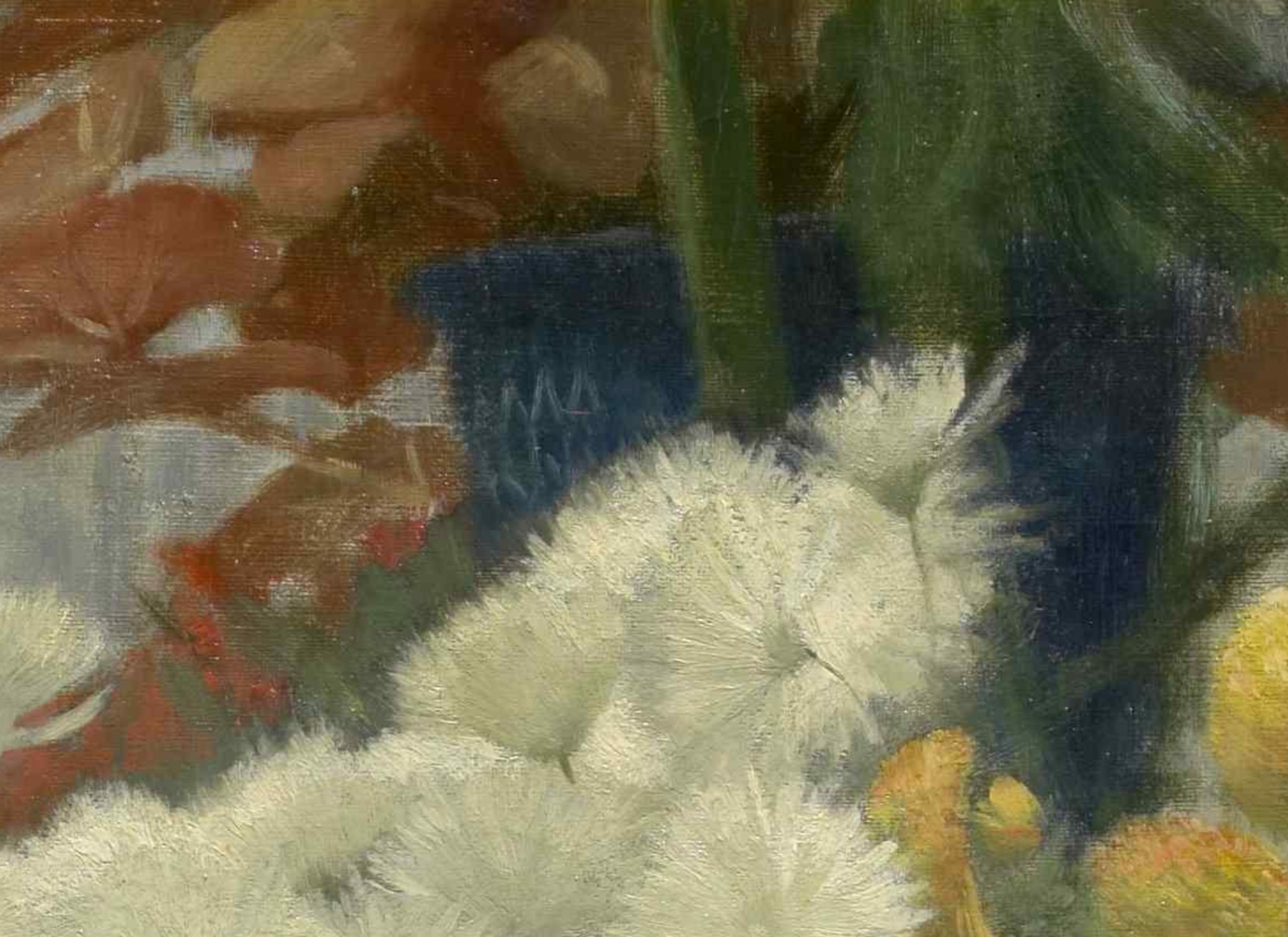 The woman in Chrysanthemums is almost overwhelmed by the brilliant blooms surrounding her. She has rolled up her sleeves to adjust a pot, her blurred features suggesting we have caught a glimpse of her in motion. Tissot staged this scene in the conservatory attached to his studio, a glass panel of which is visible in the picture’s top left corner. Conservatories were associated with the “cultivation” of proper Victorian women as well as with nurturing plants, associations that add nuance to this scene of intimate domesticity.