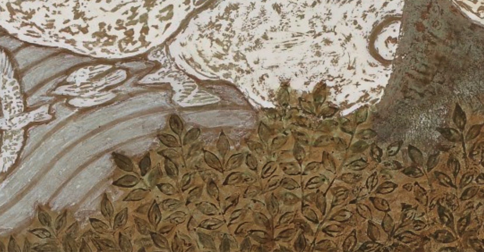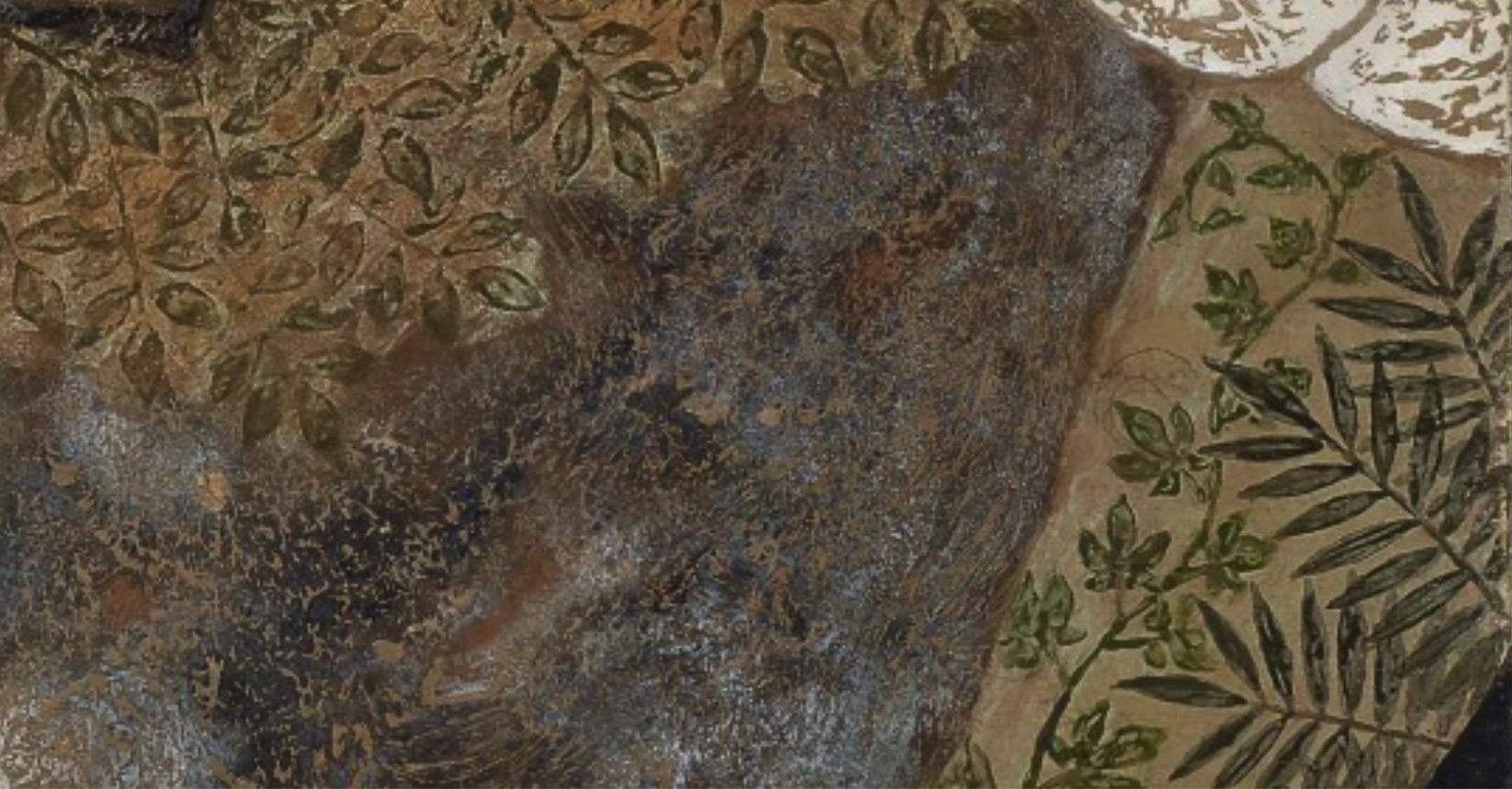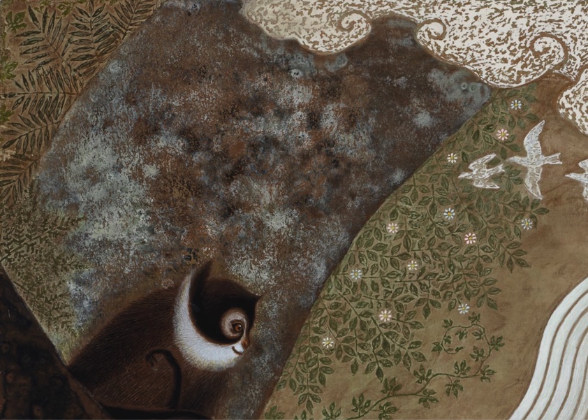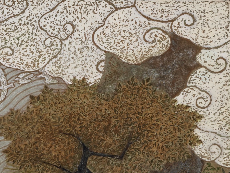 Educated in several different genres of lacquer painting, traditional Japanese painting and western painting, Toshiyuki Enoki’s works are an amalgamation of the new and the aged, reality and myth. The artist strives to antiquate his works, not only in his thematic tribute to well known traditional artists such as Maruyama Okyo, but also in his artistic process. Using particularly worn brushes, Enoki cyclically paints, erases and transfers images in his works to create a unique atmospheric depiction of nature… the details of brushstrokes and overall reflective surface are reminiscent of lacquer works which served as an inspiration to the artist. His selection of warm color palette and scattered gold leaves across his canvas creates an overall magical and tranquil depiction…