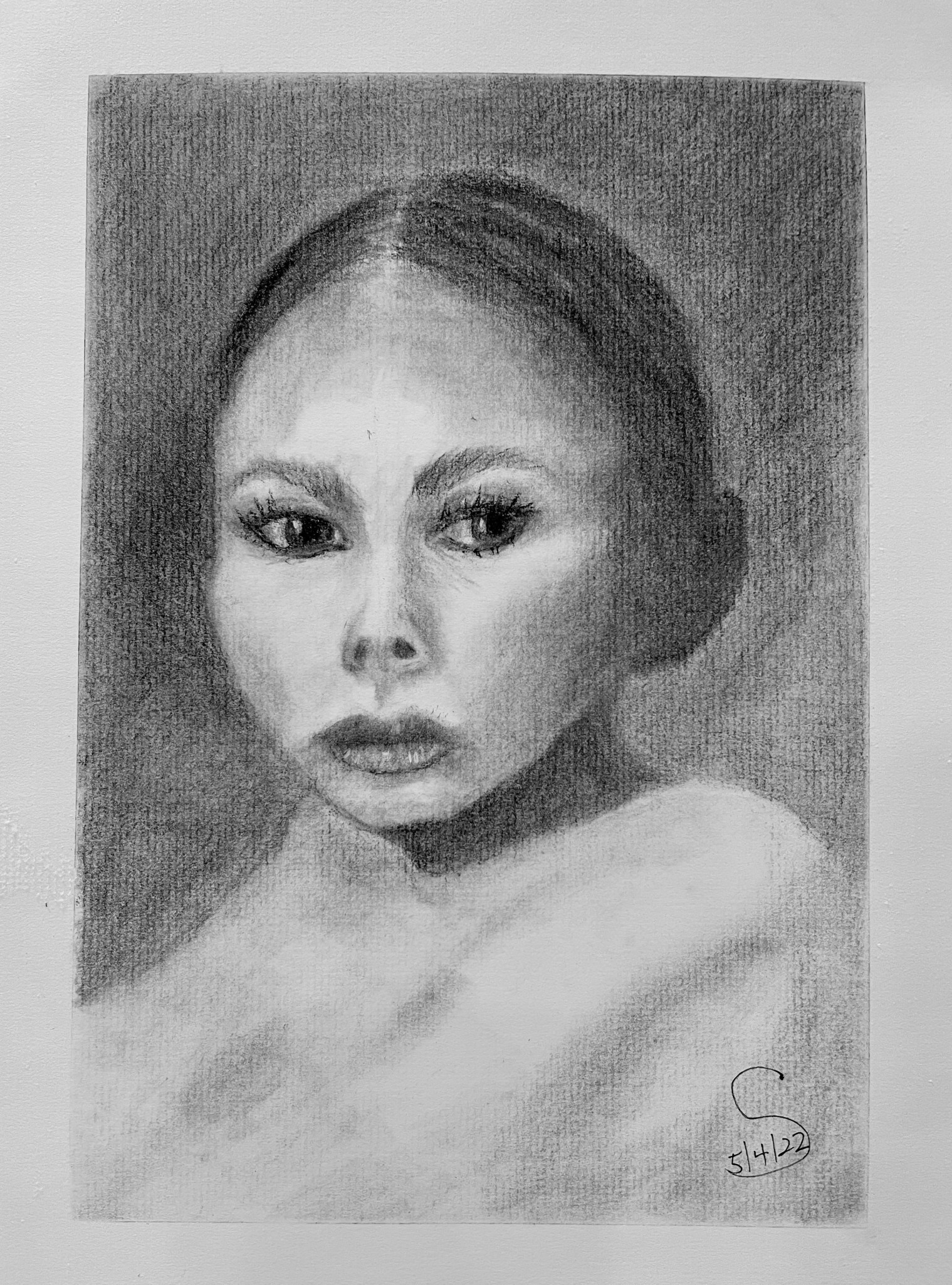 In the last few weeks I have drawn an isolated eye, nose, mouth, and ear, but this is my first time trying a whole face. I did not finish, but I am satisfied with my earnest effort and am looking forward to working on a portrait drawing course next.