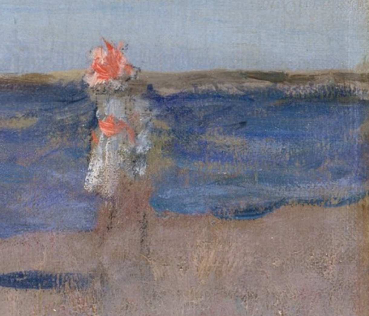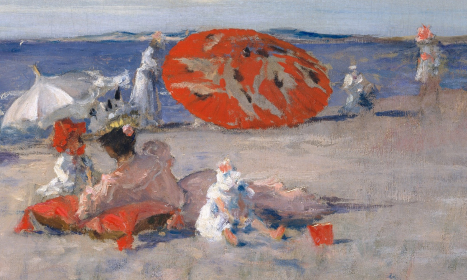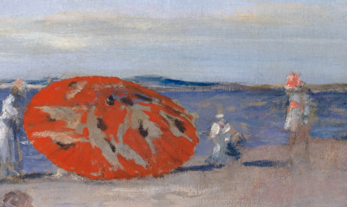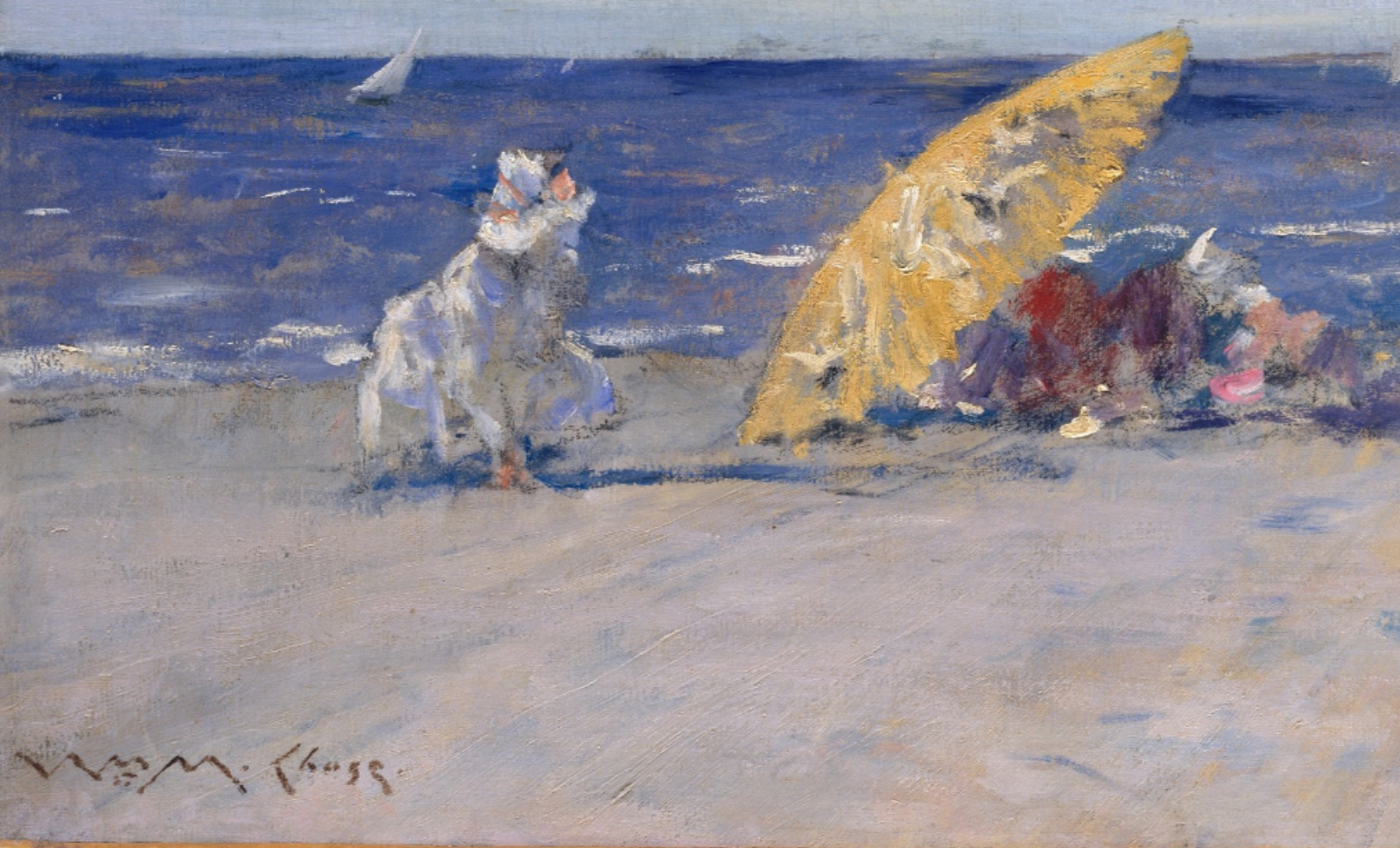 Beginning in 1891 Chase taught at a summer art school in Shinnecock, Long Island. The following year, he and his family moved into their new summer home, Shinnecock Hall… Chase taught at the beach resort until 1902, conducting open-air classes for as many as a hundred students each summer. This work is characteristic of the outdoor scenes that Chase painted during the 1890s on Long Island beaches.