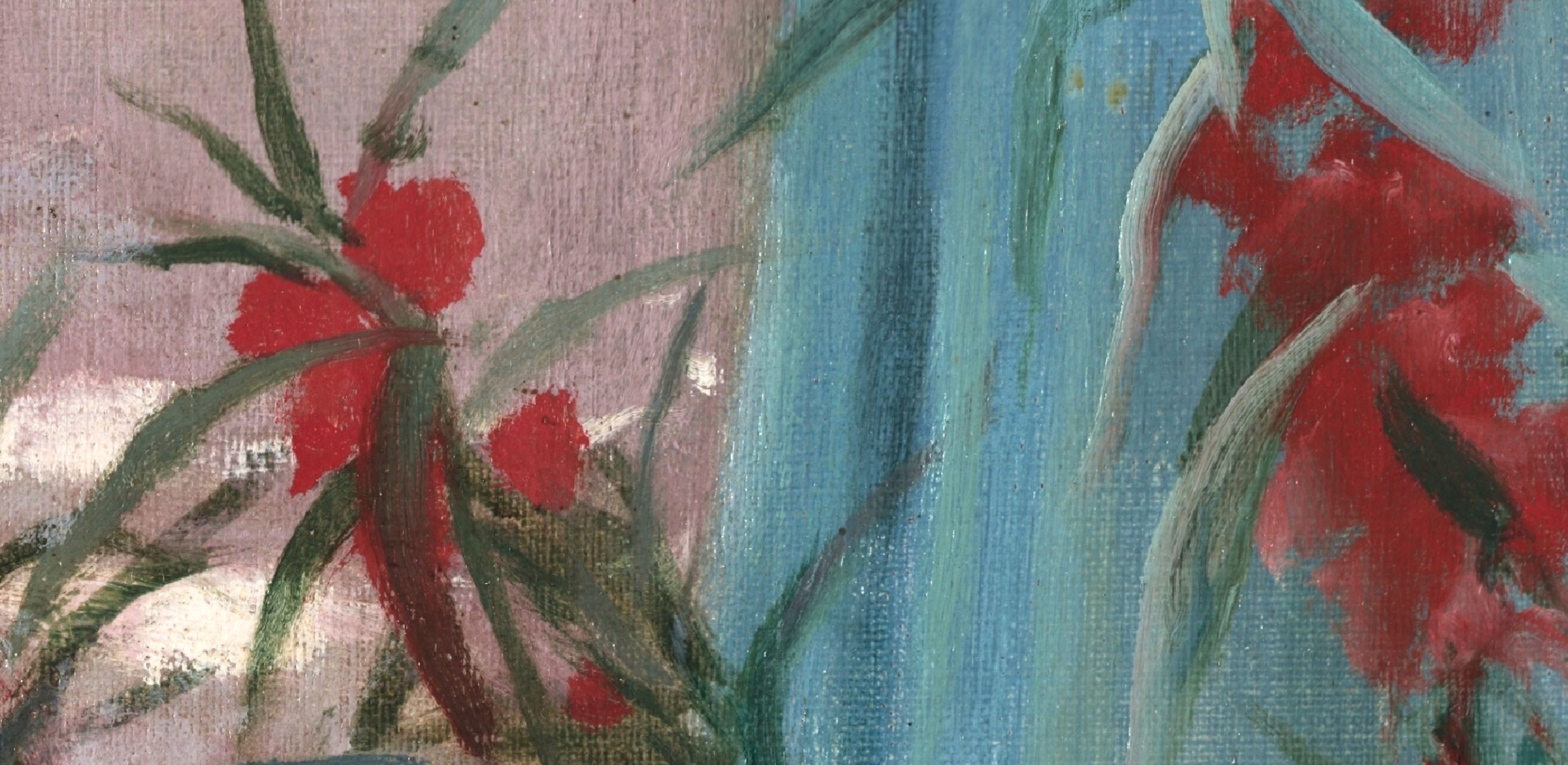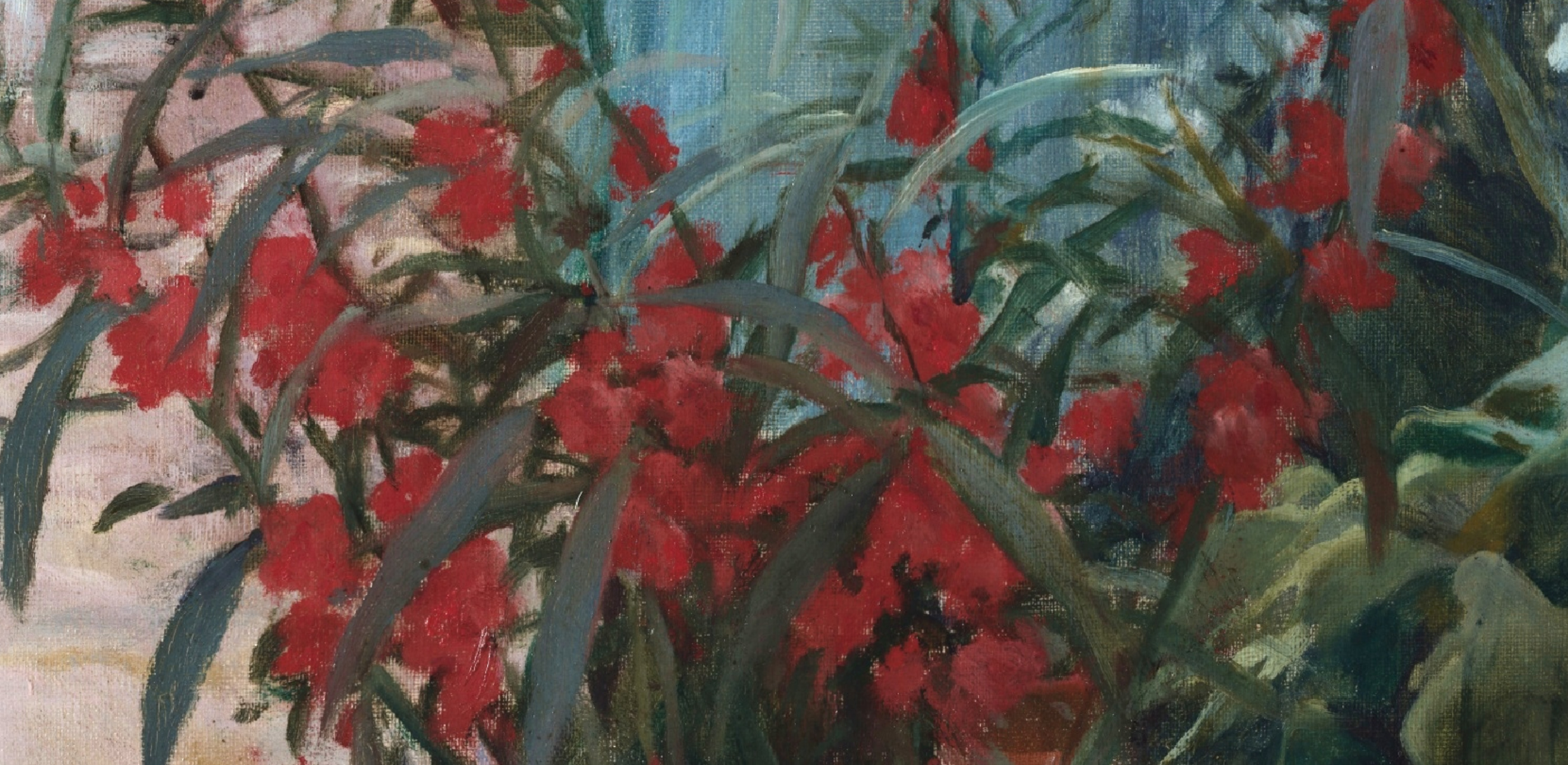 The figure is the essential part of the painting, whilst the patio is the background that surrounds it and helps to bring out the beauty of the girl, who does not seem to be aware of the presence of the painter. The colors are vivid and bright, and the girl smells, captivated, the fragrance of a carnation.