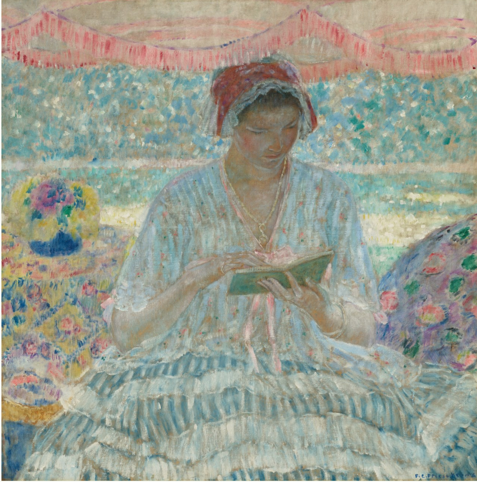 “Frieseke’s celebrated Giverny subjects of women in domestic interiors, or, such as in the present example, enjoying moments of leisure in the village’s opulent gardens, are imbued with a remarkable sense of light and high-keyed palette adopted from the French Impressionists. William H. Gerdts writes, “It was Frieseke who introduced into the repertory of Giverny painting the concern for rich, decorative patterns, related to the art of Edouard Vuillard, Pierre Bonnard, and the other Nabi painters. There are patterns of furniture, patterns of parasols, patterns of fabric and wall coverings, patterns of light and shade, and patterns of flowers, all played off one against another in bright sunshine…” (Monet’s Giverny: An Impressionist Colony, New York, 1993, p. 172). Exemplary of the artist’s ornamental sensibility, Under the Awning captures the artist’s wife, Sadie, whose clothing both complements and contrasts with the candy-colored fabrics and textures that frame her meditative moment.”