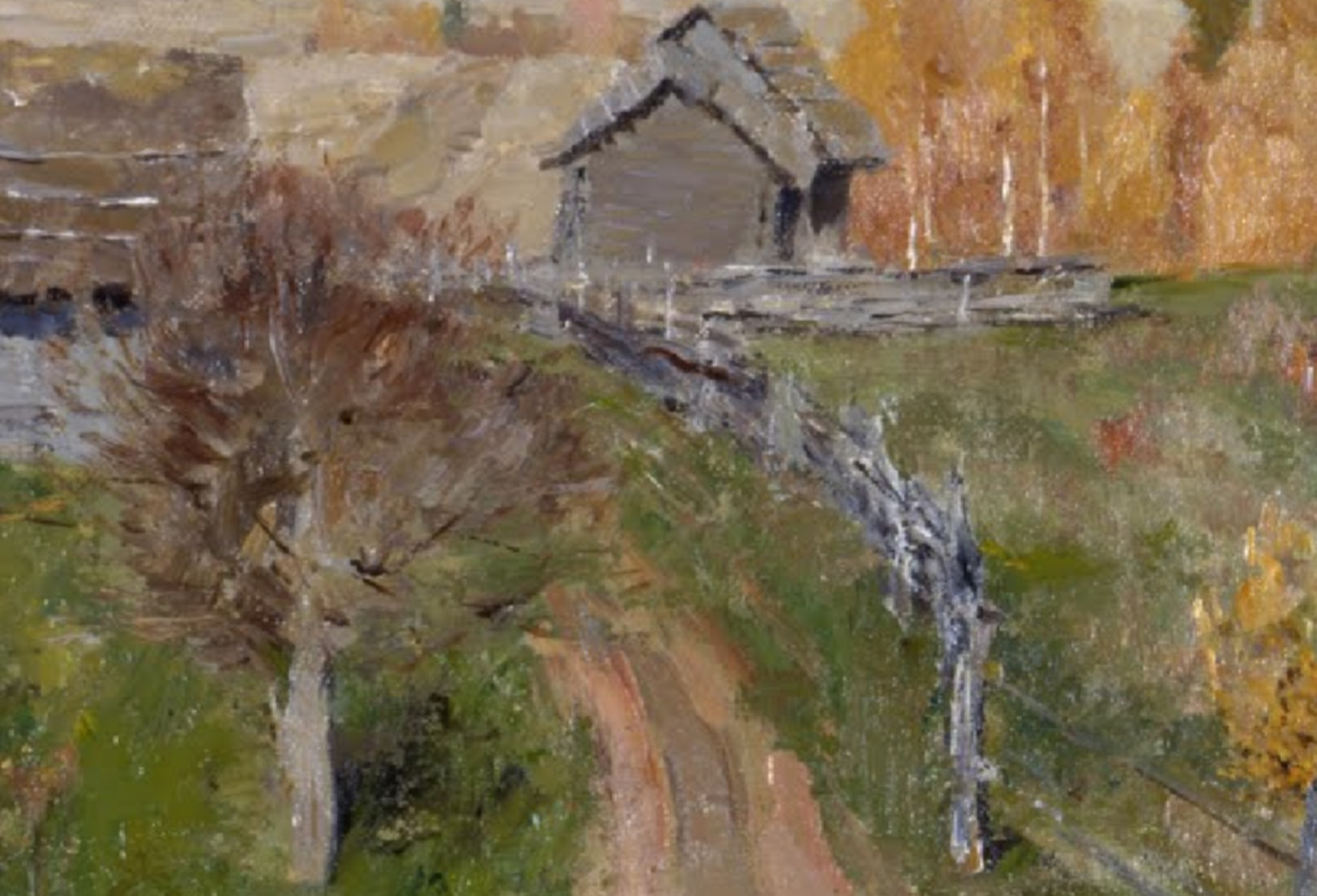The traditional gathering of autumn leaves, the special transparency of the air and the feeling of sorrow at the passage of summer found a lively response in the artist’s soul. Animating the world of nature with subtle emotions, Levitan creates a mood landscape, expressing the beauty of nature with the help of rich and complex paintwork. Growing among the peasant allotments divided by a narrow, stooping hedge, the young birch tree shows off its still magnificent foliage. This is the most active patch of paint in the entire canvas, uniting the slightly muffled tones of the rest of the colour orchestra.