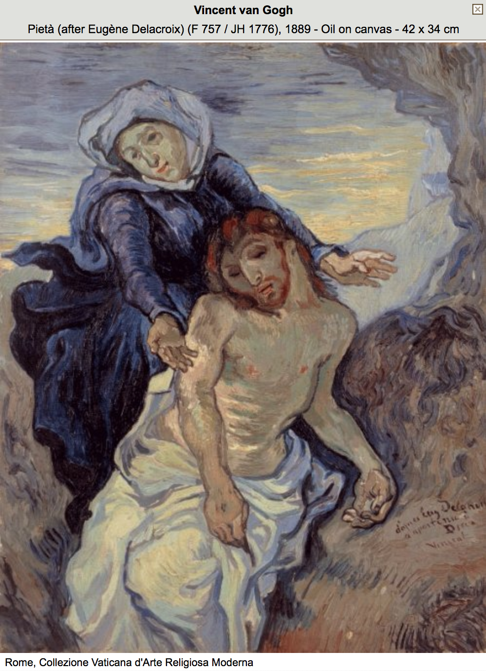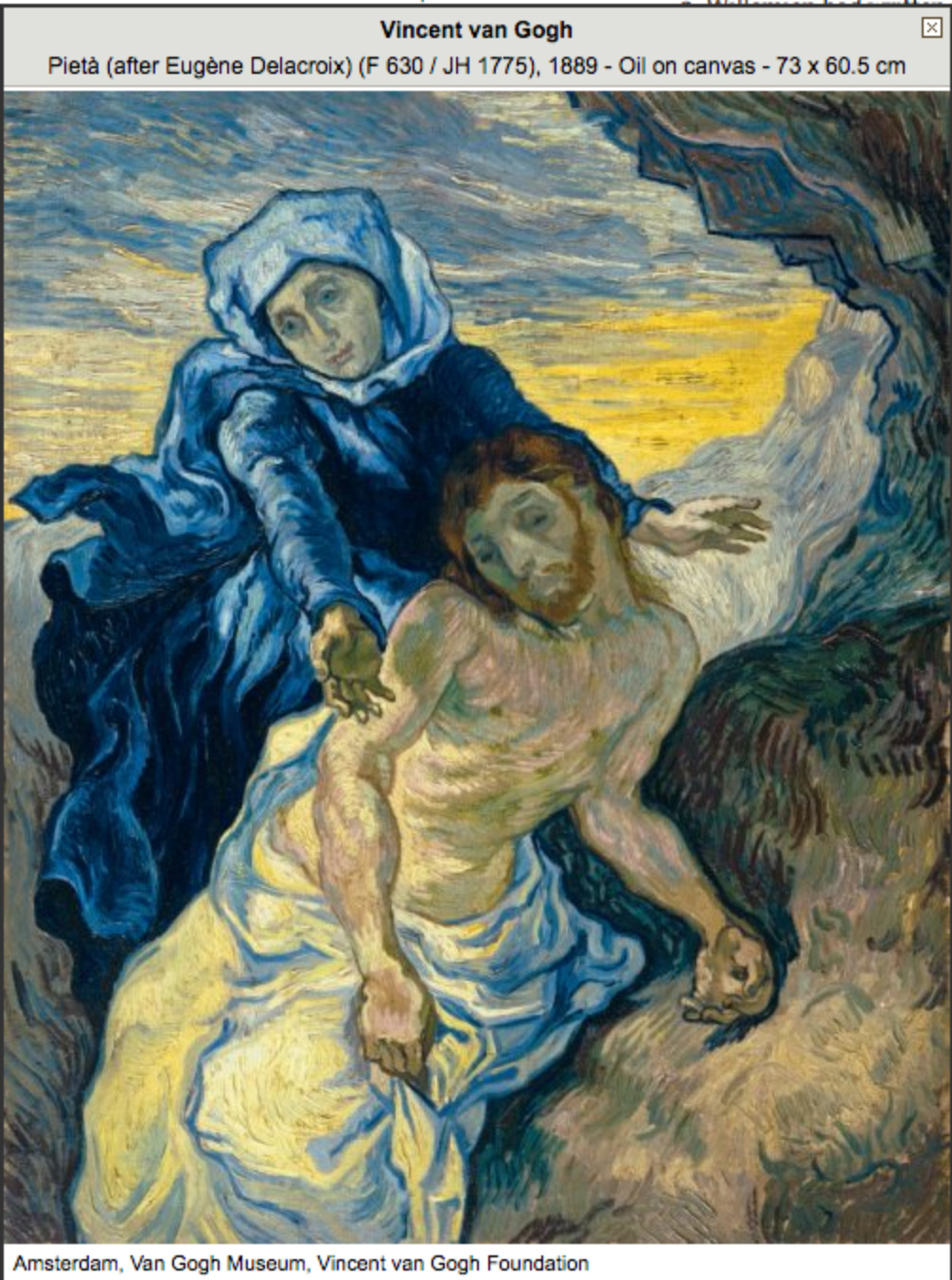 Van Gogh Museum, Amsterdam, Netherlands, “Pieta (after Delacroix)“, Vincent van Gogh, https://www.vangoghmuseum.com/en/collection/s0168V1962(accessed Sept. 11, 2018).