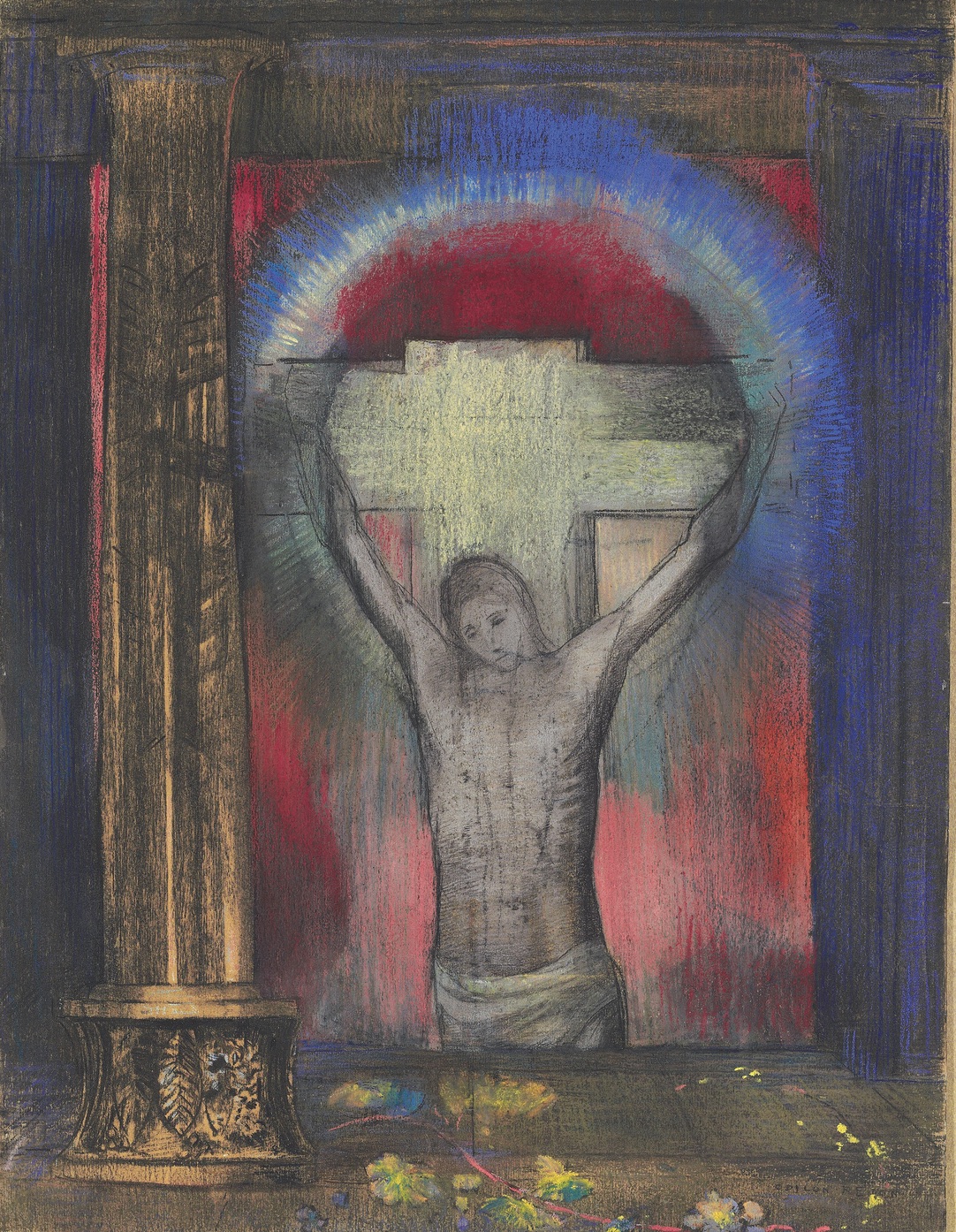 “Redon’s interpretations of the life and sacrifice of Christ contain elements of his liberal social outlook and generally underplay the traditional devotional aspect of such imagery. The present work is especially beautiful for its spiritual treatment of abstract elements in the composition. Interlocking vertical and horizontal forms frame the scene, and Christ is viewed half-length, emphasizing the interior drama of his suffering. The rainbow-like arc of light behind the cross represents the hope of salvation. The colours radiate forward from the rear of the composition in the way that light passes through stained glass. The overall effect is serenely contemplative; the picture seeks not inspire religious fervour, but to provide a balm for the troubled mind. ‘Redon identified Christ’s redemption of the fall with human evolution, representing the historical process of the race as at once a physical and spiritual process. He saw evolved intelligence as divine salvation’ (op. cit., p. 173″).”