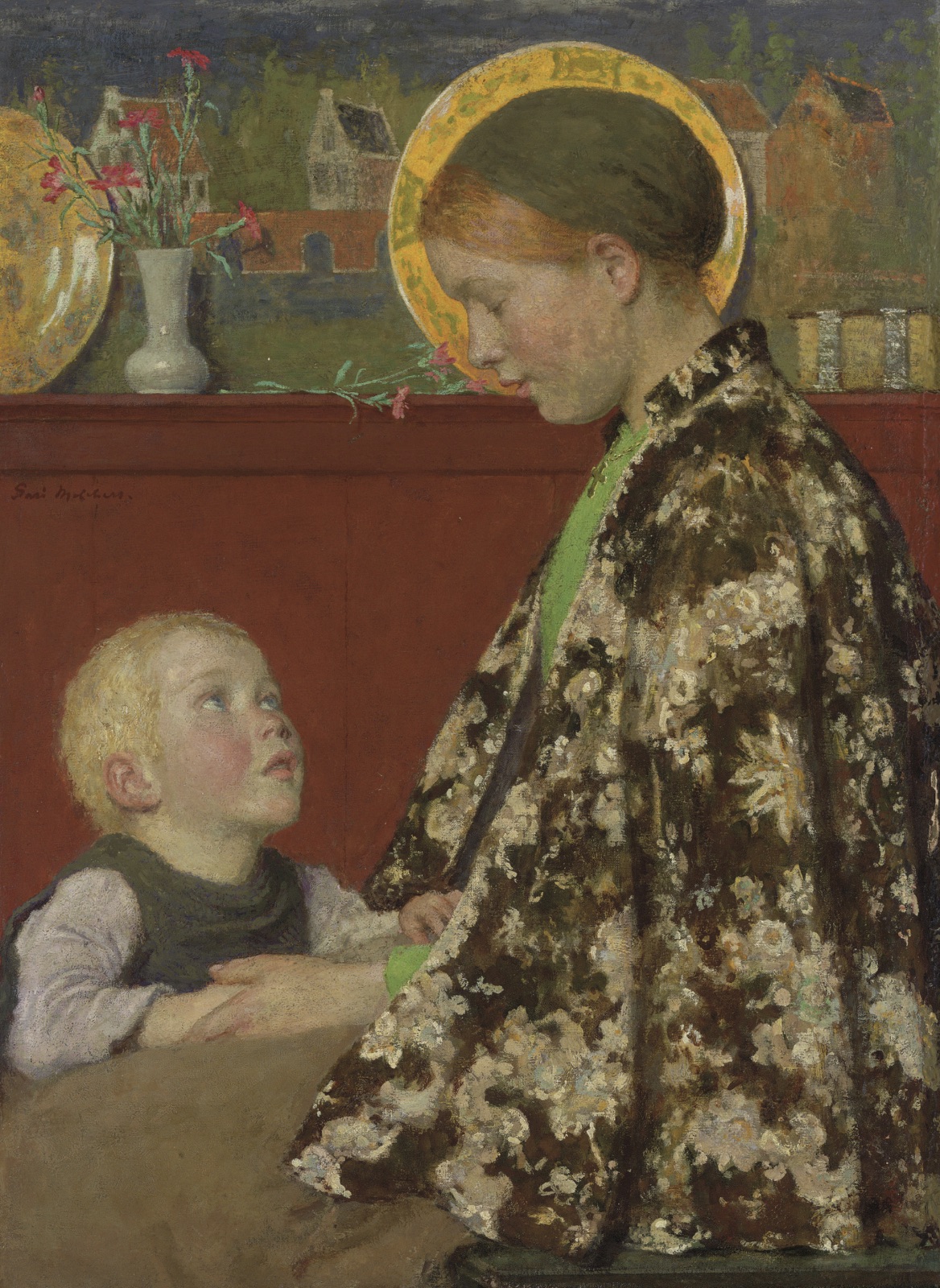 “In this poignant work entitled Young Mother, Gari Melchers portrays a mother and child, a favorite theme throughout the artist’s career, in a form suggestive of religious imagery. Evoking past images of the Madonna and Child and introducing the compositional device of a porcelain plate as a halo. Melchers creates a radiant image of a parent’s eternal love. “Melchers’s large religious genre paintings were major achievements for the young artist and still retain their original depth of meaning and expressive power. The artist’s forthright and realistic style strongly conveys the implicit moral content that underlies the subject matter. The peasants are depicted with an uncompromising honesty that is the stylistic equivalent of their personal sincerity…The carefully orchestrated compositions suggest the ordered structure that religious belief brings to experience.” (J.G. Dreiss, Gari Melchers: His Works in the Belmont Collection, Charlottesville, Virginia, 1984, p. 16)”