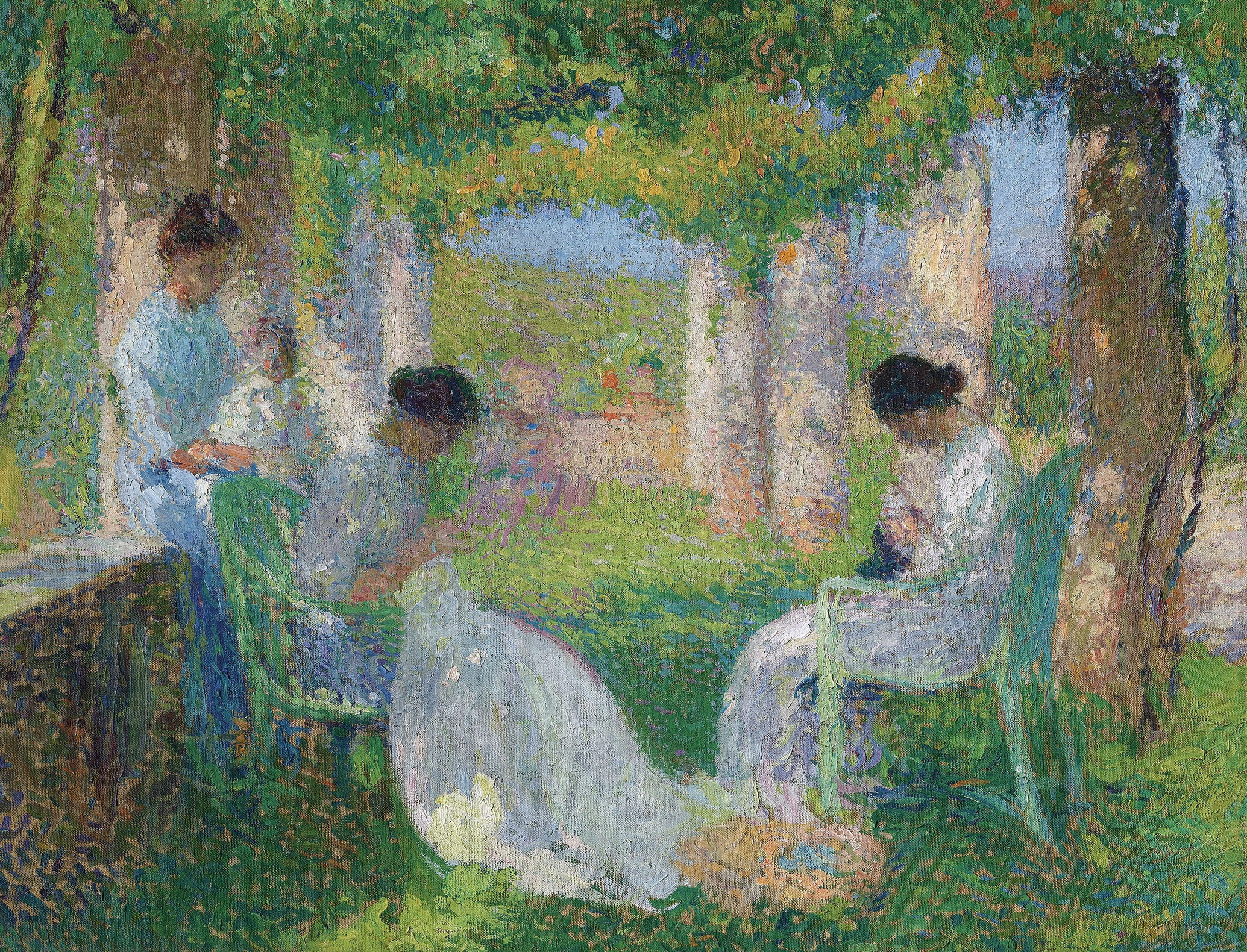 “Painstakingly composed with small touches of brilliant colour, Couture sous la grande pergola illustrates Henri Martin’s mastery of Neo-Impressionist technique, as well as his penchant for classical motifs. Depicting an outdoor scene, this work captures the vibrant effect of sunlight coming through the foliage of a pergola in subtle variations of perfectly harmonised tones. Decomposing the spectrum of light into small brushstrokes of pure colour, Couture sous la grande pergola shows Martin’s ability as a colourist, as well as a Neo-Impressionist painter.