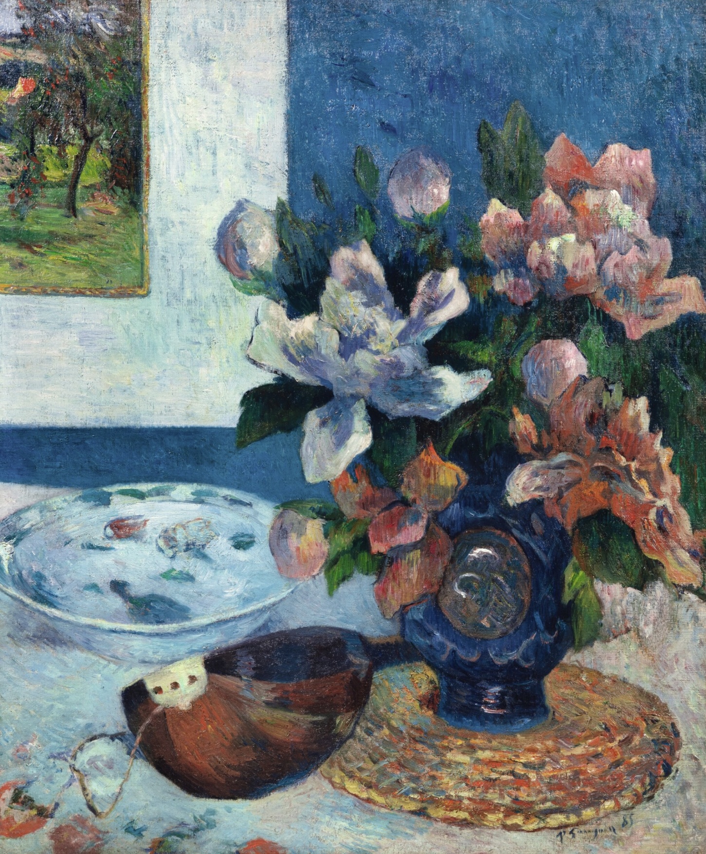 “The dominant blue palette in Nature morte avec pivoines de chine et mandoline is exceptional not only for its brilliance and rarity within Gauguin’s oeuvre but also for its evocative symbolism within art history. Often connoting the numinous and the divine, the color blue and its spiritual significance would not have been lost on the artist, who was raised in the Catholic tradition. From the frescoes of Giotto and the characteristic mandorlas of the Virgin Mary to starry skies of Van Gogh and the nudes of Yves Klein, the color blue has captured the imagination of artist for centuries (see figs. 4-5). The brilliant hue which dominates Nature morte avec pivoines de chine et mandoline reappears occasionally throughout Gauguin’s oeuvre (see fig. 6), though rarely to such an alluring and impactful degree.”