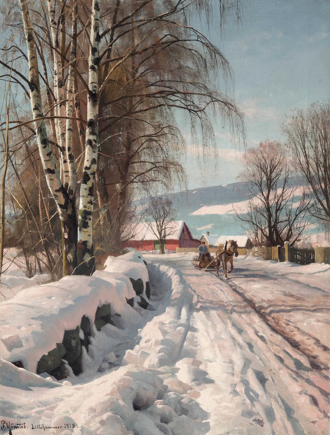 Peder Mork Monsted (Danish, 1859-1941) A snow covered track in Lillehammer signed, inscribed and dated ‘P Monsted. Lillehammer 1918.’ (lower left) oil on canvas 30 x 22 3/8 in. (76.5 x 57 cm.), Image Source: Christie’s