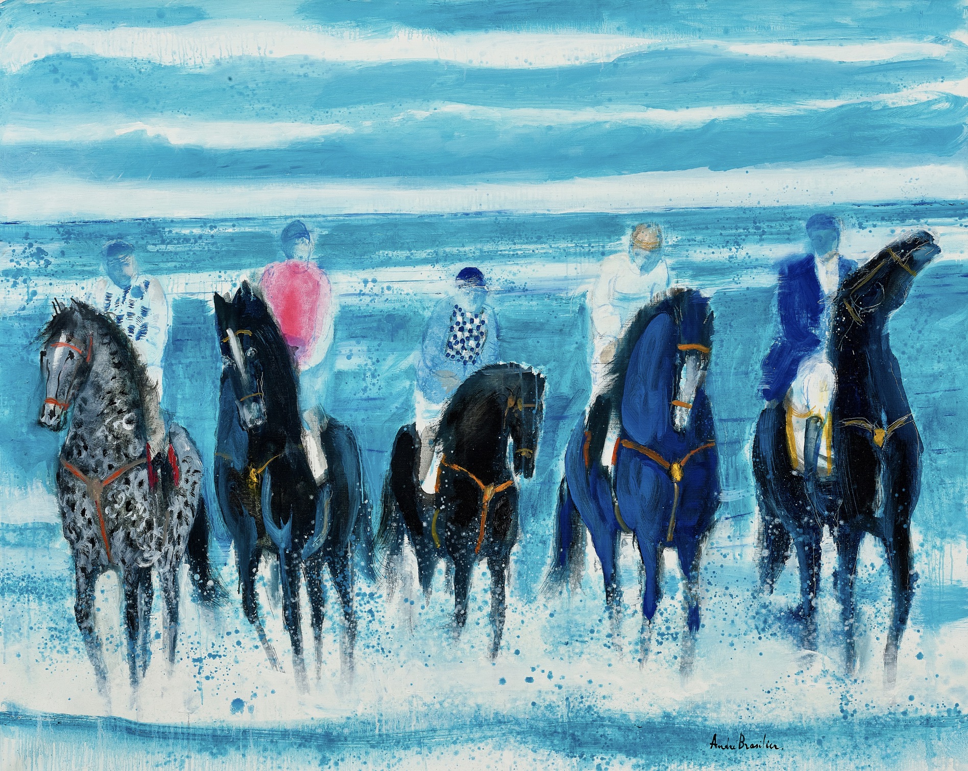 “André Brasilier is one of the few surviving École de Paris artists. He stands out in the Parisian modern art scene for his unique style that fuses Fauvist, Impressionist, Expressionist, and Symbolist elements. In a career spanning more than seven decades, horses have consistently been one of his key subjects. In Cavaliers devant les vagues (Lot 516), horses with riders stand majestically in the surging waves. The five horses all present different energies, postures, and coat colours. A few of the horses stride forward with their heads held high, while others wait to pounce, as if they could burst through the canvas at any moment…”