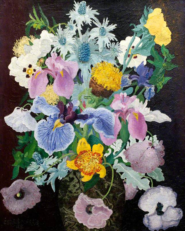 “Morris would grow his colourful subject matter in the garden at Pound Farm where he also had a studio, and one of his ex-students, Joan Warburton (1920–1996), later reminisced how ‘to go in there quietly when Cedric was painting the favourite of all his flowers, Irises, was a revelation.’ It was Morris’s incredibly close contact with his subject and deep understanding of their design that enabled him to paint flowers as if they were people – with a mood and personality.”