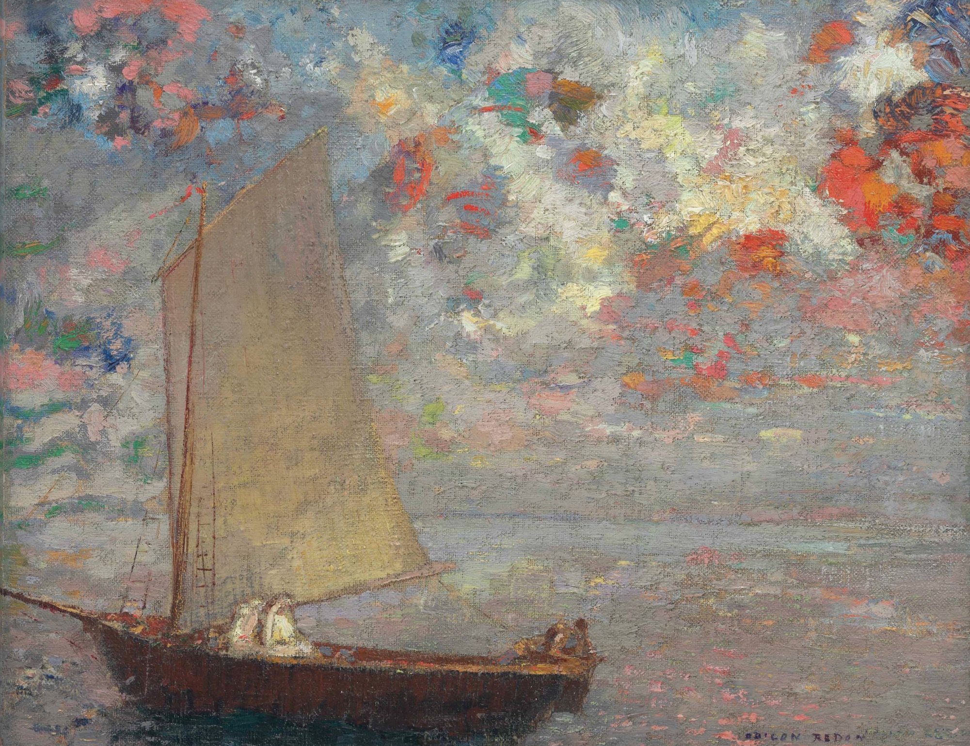 “La barque aux deux femmes blanches is an iconic Redon seascape, the figures seemingly rapt in pensive silence, immersed in the radiance of inward visions, transported to distant unknowable realms on spectral currents of dream…Through his use of vibrant tints of color, he made the mainstay of his new work a brilliant, otherworldly fluorescence of color by which he could conjure the fleeting essence of dreams.”