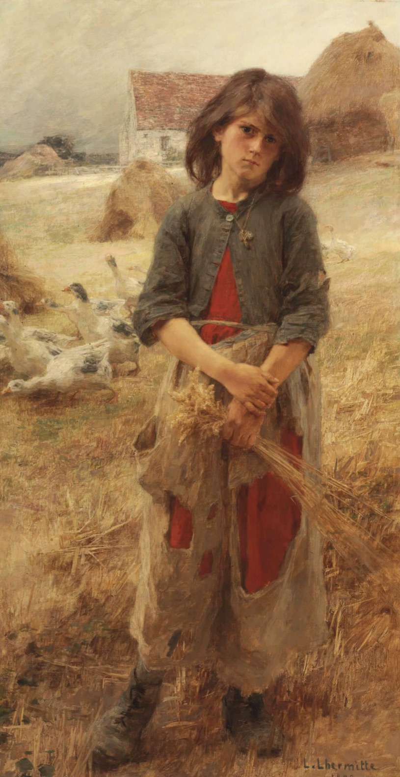 The Little Goose Girl of Mézy is Léon Lhermitte’s most important single-figure painting, a work that forthrightly declares its modernity in the directness of the young goose girl’s interaction with the viewer and in the slashing knife and brushwork that so tangibly conveys the stubbled grain field on which she stands…With her small bundle of grain, Lhermitte underlined her industriousness, indicating that this goose girl has been doing double-duty, gathering up stalks of wheat missed by the departed reapers as well as watching her feathered charges. Although her tattered apron may suggest poverty, the plump geese and massive grain stack incorporate her into a prosperous farm; and she looks out at the observer with a quizzical nonchalance that bespeaks settled confidence, not victimhood. In such circumstances, the shredded garment seems to be merely protective field wear, a well-worn hand-me-down.