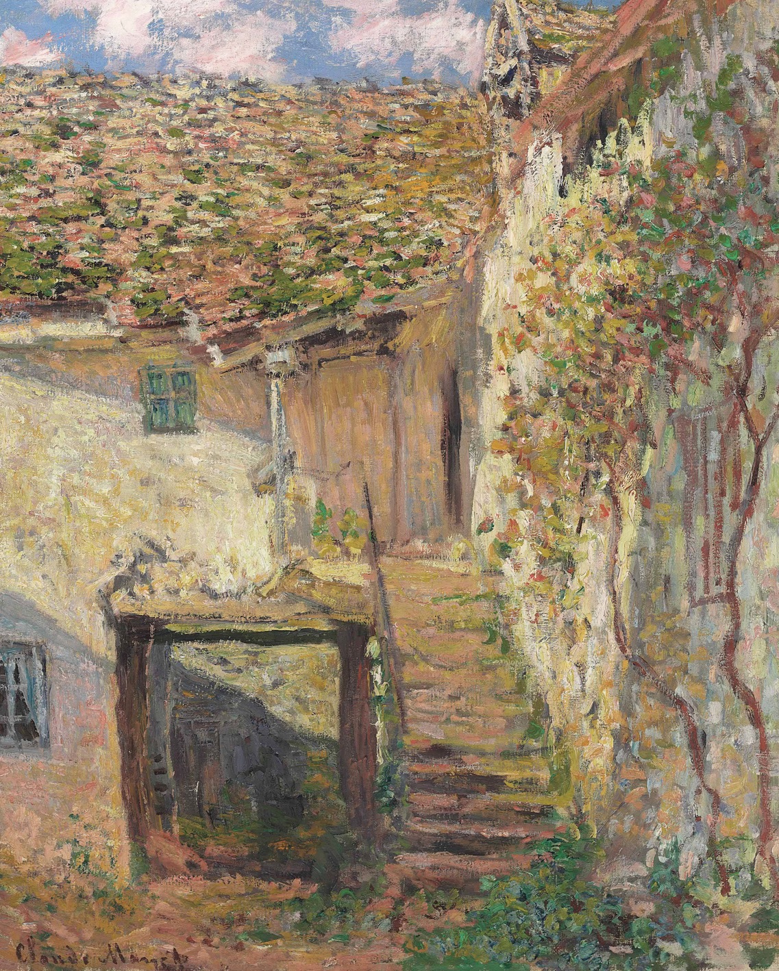 “In L’Escalier, Monet has selected as his subject an unprepossessing but utterly charming corner of an old farmyard. The pale stucco walls and steeply slanting, shingled roofs form a shallow succession of jostling planes, with only a narrow strip of cloud-flecked sky visible at the top of the canvas. In compositional terms, L’Escalier is anchored around a narrow set of stairs that leads the viewer’s eye into the scene, a device that Monet would reprise three years later in his celebrated views of Jean and Michel in the garden of the family’s home at Vétheuil (fig. 4). The subtle but richly nuanced palette of L’Escalier is dominated by yellow, ochre, and sepia tones, which suffuse the scene in a warm, autumnal glow. Weathered buildings and fall foliage alike are painted with the same golden hues and active, flickering touch, suggesting that the work of man and that of nature–rather than being at odds, as Monet had come to find them at Argenteuil–are harmoniously and inextricably linked in this rustic, peaceful milieu.”