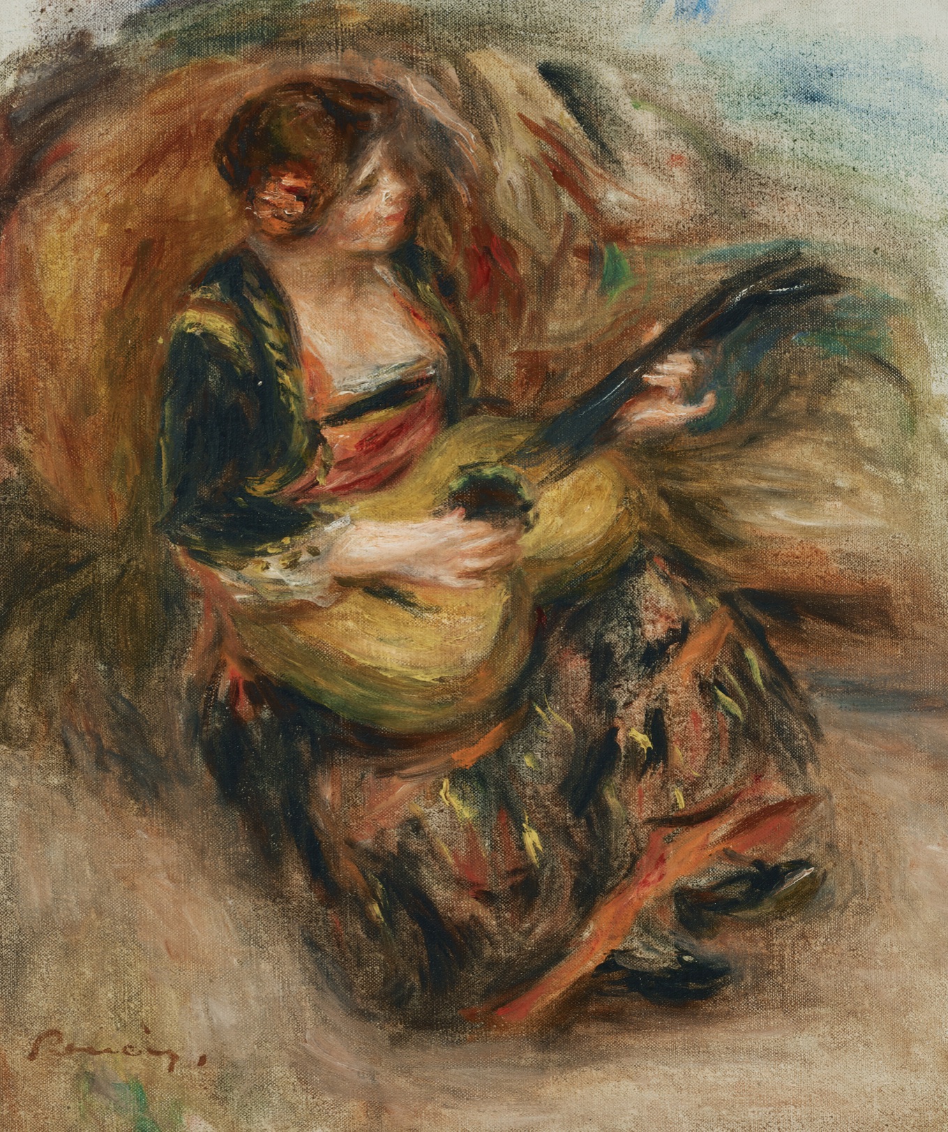 Jeune femme assise jouant de la guitare belongs to a group of works that Renoir painted of women and men playing the guitar. Renoir’s appreciation for “La Belle Otéro,” a dancer at the Folies-Bergère who was celebrated at the time as the embodiment of Spanish seduction, is thought to have inspired these works. Although the model in the present work lacks the overtly Spanish costume seen in Jeune espagnole avec une guitare, 1898 (National Gallery, Washington, D.C.), her outfit still gives the impression of a costume piece. This dramatic clothing contrasts the modest, informal modern dresses that the painter used in his numerous scenes from this period of young bourgeois women talking, reading and sitting together.