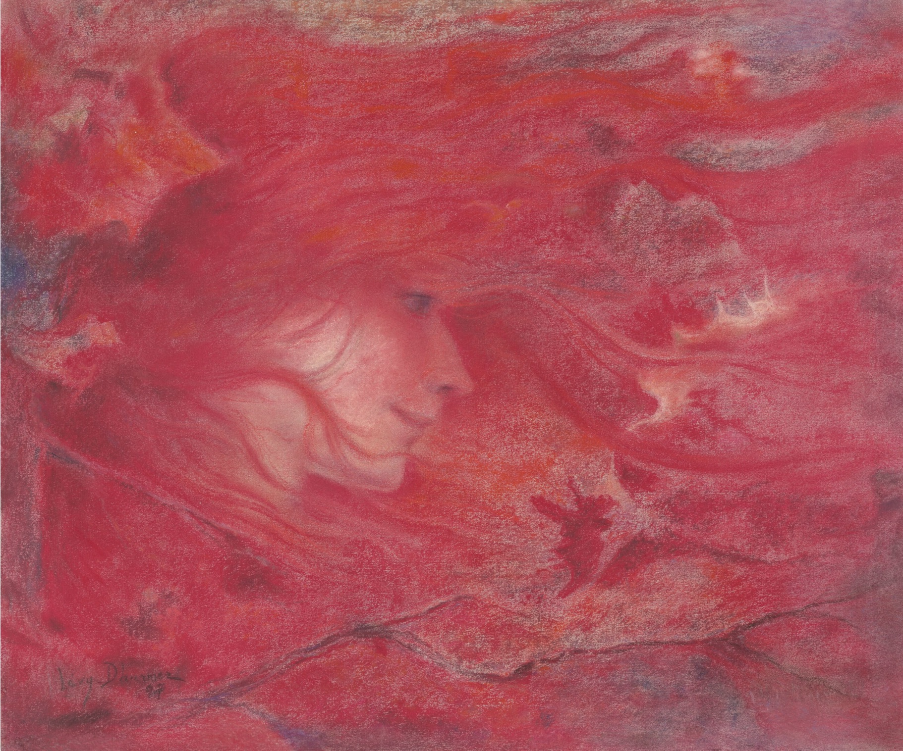 “Lucien Lévy-Dhurmer, ‘The Dream Painter’, was one of the leading painters of the Symbolist ideal at the turn of the century…La bourrasque, which translates as ‘The squall’, formed part of a strikingly ethereal series of portraits based upon the theme of the four seasons. The present work illustrates autumn and became the subject matter of much experimentation during the late 1890s, resulting in a painting under this title being exhibited twice in Paris in 1896, first at the Galerie Georges Petit (no. 3) and later at the Salon (no. 1261). The present pastel is perhaps one of the artist’s most strikingly beautiful examples. The girl’s windswept hair falls in wisps upon her face and the vibrant, other-worldly colours instantly transport the viewer from the seasons in this world to those of another.”