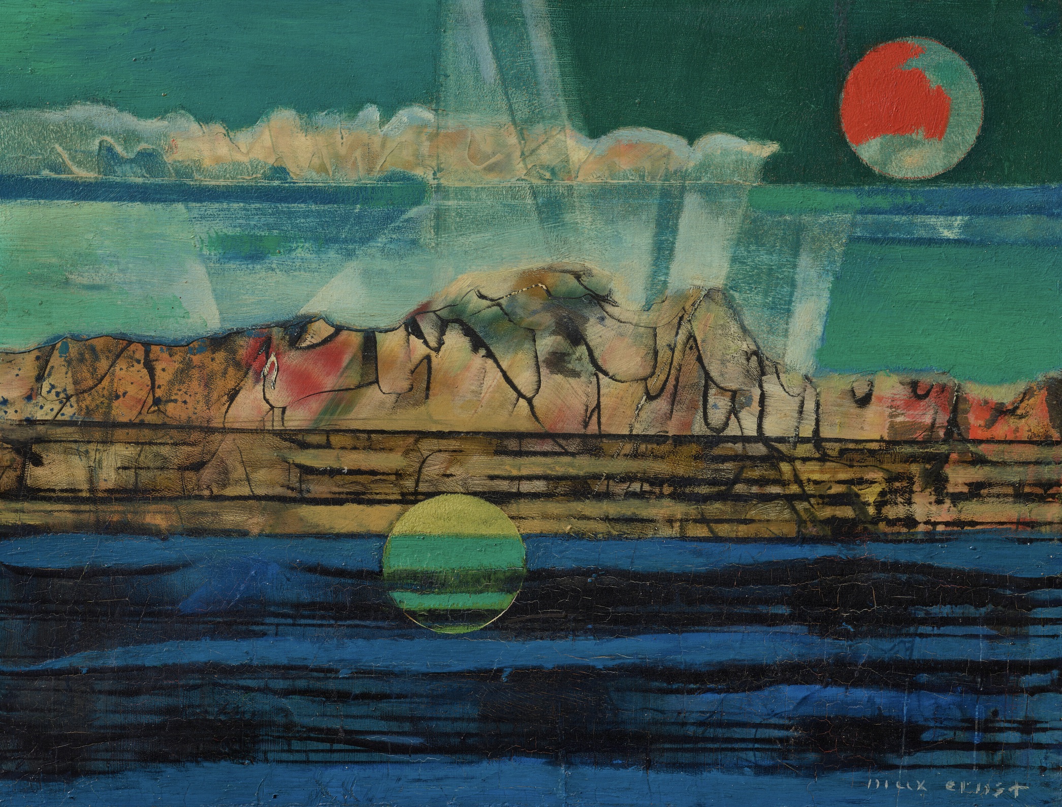 “Arizona reappears as a motif throughout Ernst’s oeuvre, serving as blank canvas upon which the artist was able to project his psychological frame of mind. His grattages from the interwar period had depicted an imaginary Arizona landscape that appeared bleak and ravaged, reflecting Ernst’s traumatized state of mind after having served in World War I. Conversely, Calme, painted several decades later in 1958, invokes the tranquility and peace Ernst had encountered in the Arizona desert. Executed several years after his move to the France, Ernst was in a new phase of life, developing a deep interest in spirituality and cosmology. Once again opting for a secluded location, the couple had taken up residence in Huisnes in the Loire Valley, and in a letter, Ernst described how ‘it is beautiful and gentle and calm here’ (quoted in W. Spies, Max Ernst Retrospective, exh. cat., Ostfildern, 2013, p. 279). This feeling of serenity can be felt in Calme, as a sense of stillness permeates the painting, with gentle ripples in the water lapping the mountainside edge. The mysticism Ernst associated with the Arizona landscape is conveyed by the white rays of light, which radiate from an enigmatic source. Rather than being emitted from the vermillion sun in the sky, they appear to both simultaneously emanate from and light up the mountainous landscape.”