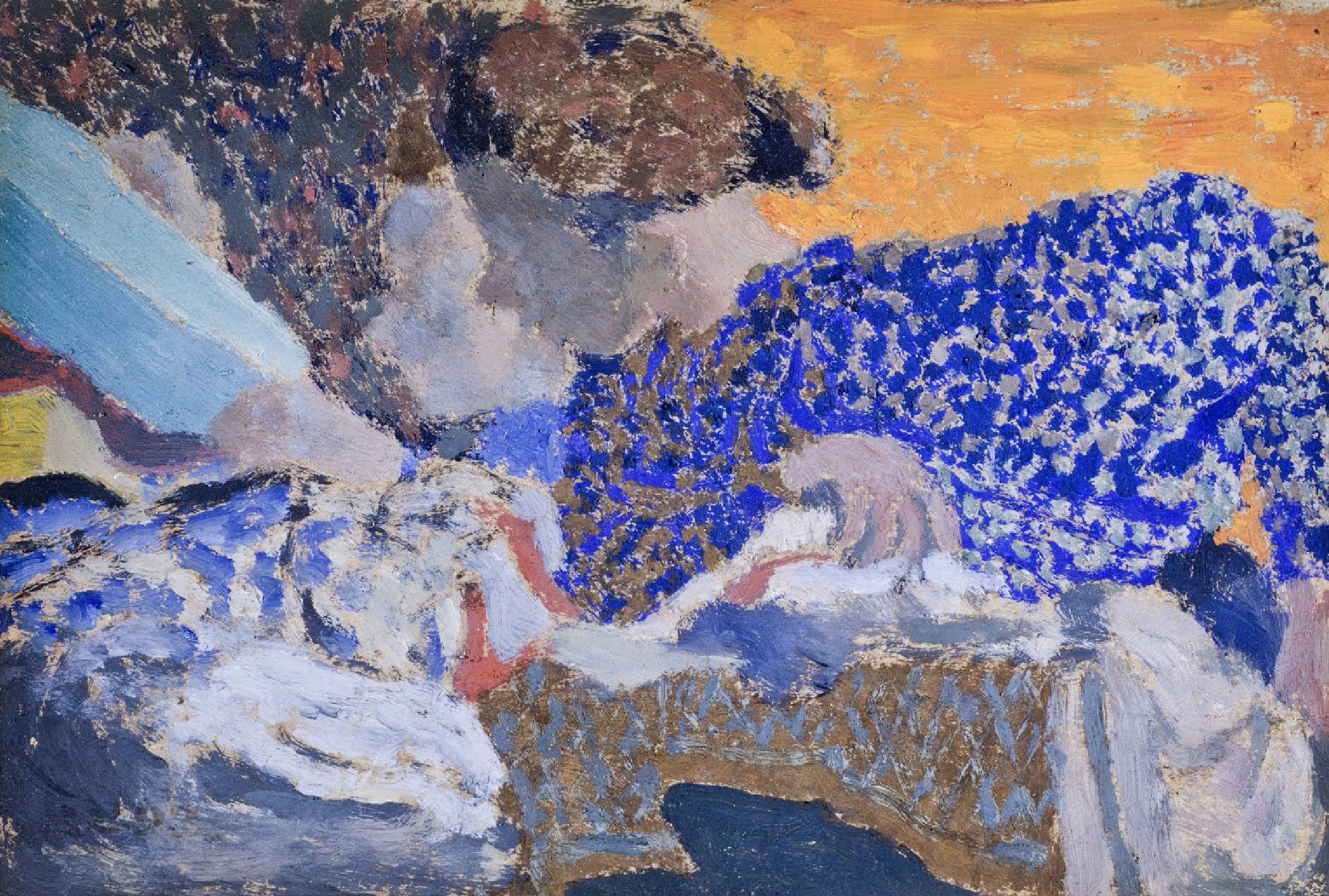 “The women seen in profile in the painting worked for Vuillard’s mother in her corset and dress-making business. For a few years in the early 1890s Vuillard’s paintings became so highly patterned that they verged on abstraction. It is likely that his day-to-day contact with patterned materials through his mother’s work influenced his very intricate, decorative style of painting.“