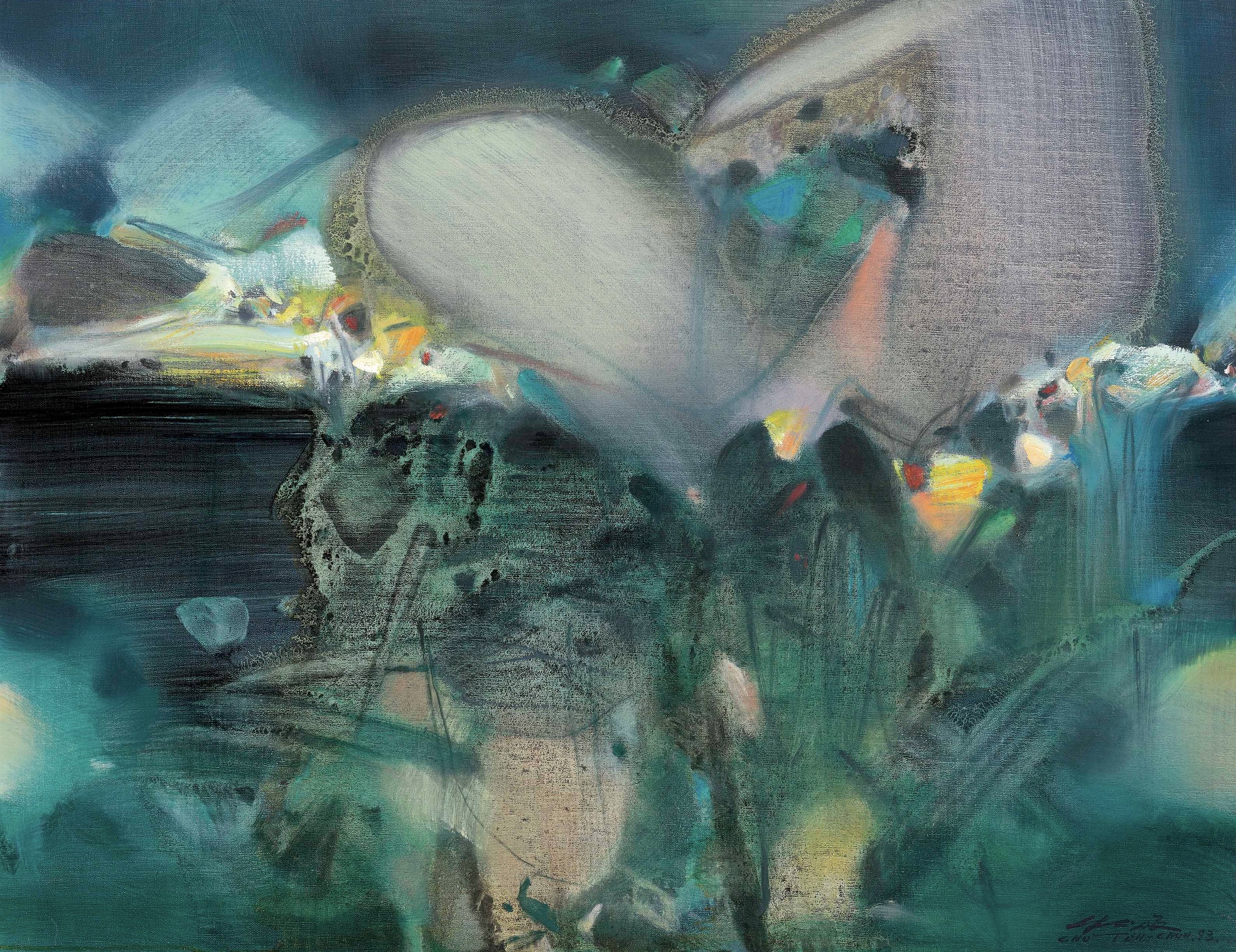 CHU TEH-CHUN (ZHU DEQUN, 1920-2014), L’Imprévu (The Unexpected) signed in Chinese, signed and dated ‘Chu Teh-Chun. 93.’ (lower right); signed in Chinese, signed, dated and titled ‘L’Imprévu 1993 CHU TEH-CHUN’ (on the reverse), oil on canvas, 73 x 90 cm. (28 3/4 x 35 3/8 in.), Painted in 1993, Image Source: Christie’s