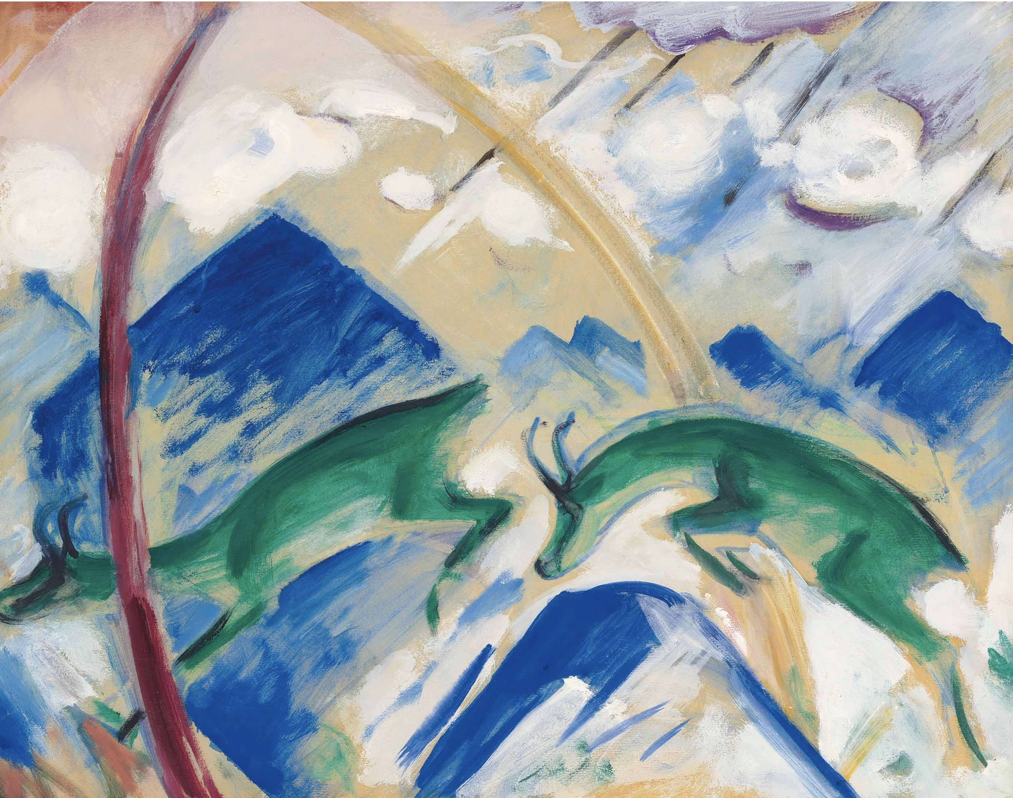 “After the artist’s death on the Western Front in 1916, Marc’s widow and organizer of his estate described this work as follows: ‘In front of a stormy sky lightly tinged from purple to rusty red, draped with small clouds, blue crags with different shading (ultramarine) in the foreground, two green chamois are jumping across blue rocks. The rhythm of their movements is accentuated by two coloured semicircles (tree-trunks), diagonally cutting through the whole picture. In colours complimentary to Blue against Green (orange and reddish brown)’ (M. Marc, ‘Notes on Gemsen’, quoted in A. Hoberg & I. Jansen, Franz Marc, The Complete Work, vol. 2, London, 2004, p. 167)… The ‘animalisation’ of art was Marc’s aim of rendering a pictorial vision of the world as it might be seen from within – through the feeling and the senses of the living, sentient beings (animals and man) who inhabited it. Gemsen, with its two chamois or mountain goats shown elegantly springing against an undulating blue-mountain background and through an aperture formed by the curve of two trees, is a deceptively simple and in fact stunningly composed painting that both asserts and encapsulates this visionary aim.”