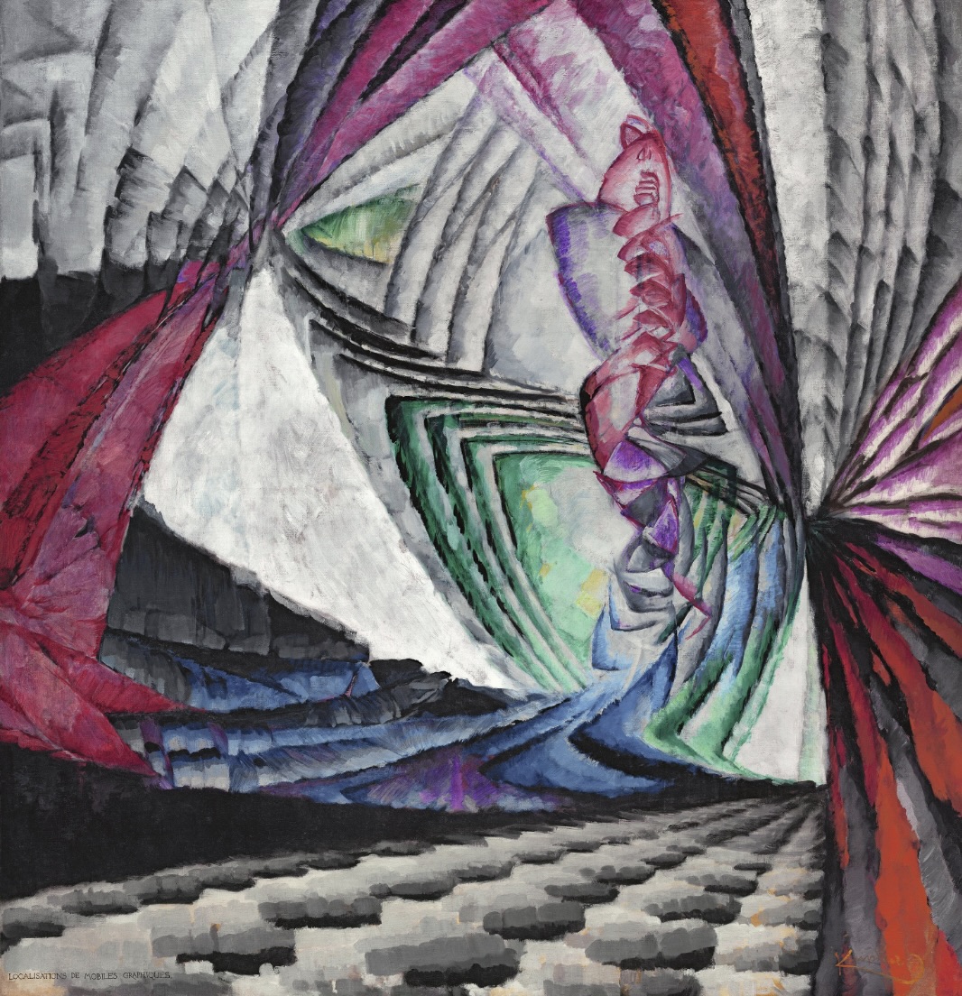 “The expression Localisation des mobiles graphiques, as these works are entitled, appears frequently in Kupka’s theoretic writings, where it is defined as the process of exteriorising a motif that springs from the artist’s inner self and not from the perceived world: “In our inner visions, fragments of images float before our eyes. In order to capture these fragments, we unconsciously trace lines between them and by thus setting up a network of relationships, we arrive at a coherent whole. These lines drawn to organize our visions are like ‘stereoscopic bridges’ from fragments in space.” Paloma Alarcó