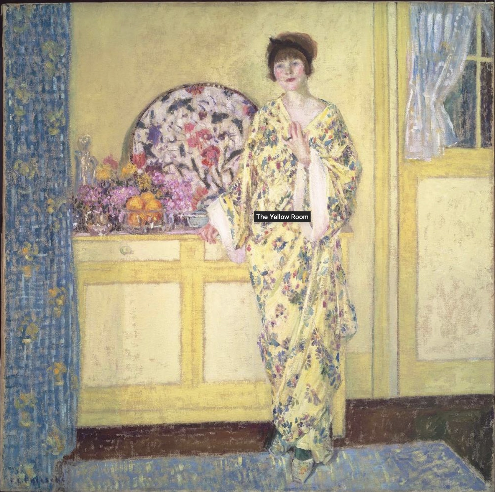 “In The Yellow Room Frieseke fused bold color juxtapositions and careful formal design, bringing together the qualities he most admired in the work of Monet and Whistler. He posed his model in the living room of his own house in Giverny, which itself was one of his artistic creations. Frieseke had painted the walls lemon yellow and ornamented the room with blue rugs and curtains, a striking color combination that Monet had also employed in his home. Against this backdrop Frieseke posed a costumed model, arranged Japanese ceramics, and massed containers of fruit and flowers to create a panoply of color and pattern. The large Imari-style plate and the model’s kimono reflect the artist’s interest in Asian art, with its emphasis on two-dimensional design and ornament. The wealth and variety of patterns Frieseke employed, as well as the way in which the figure is not given precedence but instead merges into its surroundings, also recall paintings by Pierre Bonnard and Edouard Vuillard. Like those modern French artists, Frieseke created intimate domestic interiors that use bold decorative arrangements to explore the shifting relationship between paintings as representations of the real world and as independent abstract designs.”
