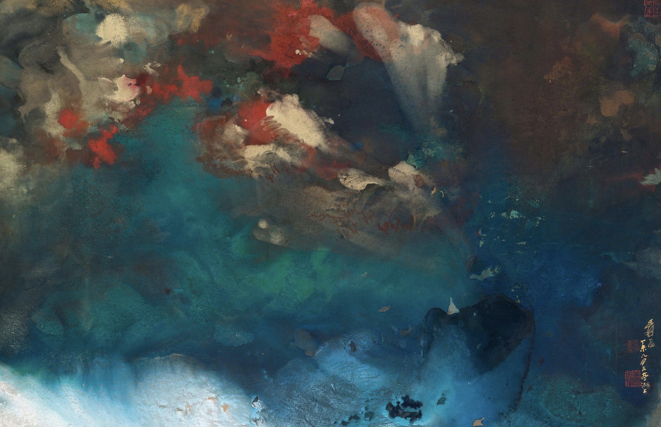 “The painting was particularly cherished by Zhang, as he once stated that it was a representation of water running into one of the man-made lakes on his ranch in Brazil… Contemplating Upon an Autumn Landscape was painted in 1967 at the height of the development of Zhang Daqian’s semi-automatic splashed ink and colour technique. This creative zenith was brought about partly by his ailing eye sight, which imposed limitations on the fine gongbi painting that he practiced ceaselessly under the inspiration of masterpieces of the Song, Ming and Qing dynasties before the 1950s. The success of Zhang’s pomo style should not be read as Zhang’s inability to adhere to his previous style and flair, but rather his wisdom to revive a Tang dynasty artistic tradition and renew it with modern enthusiasm.