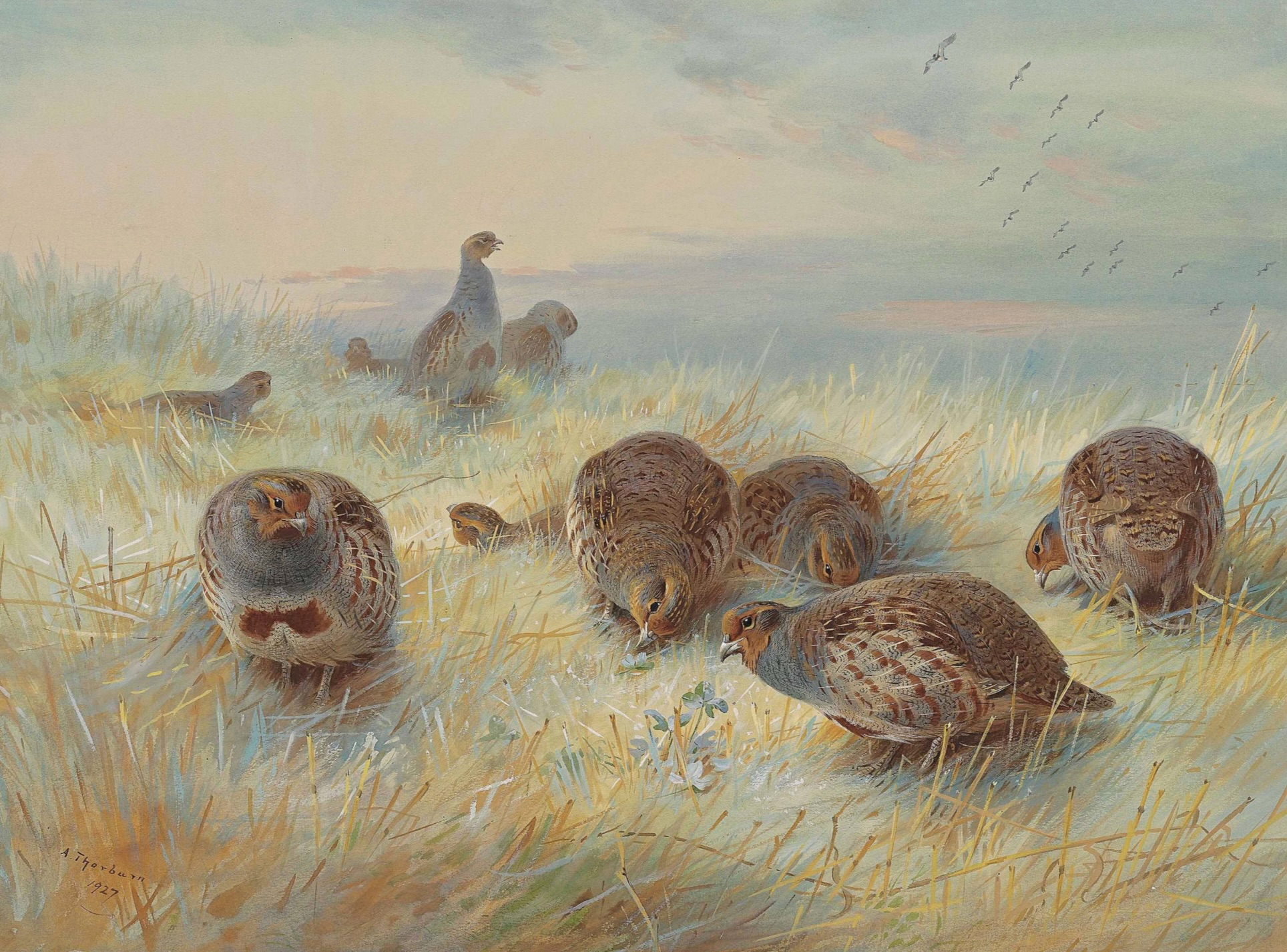 Archibald Thorburn (Scottish, 1860-1935), ‘A frosty dawn’, signed and dated ‘A. Thorburn/1927’ (lower left), pencil and, watercolour heightened with bodycolour and touches of gum arabic on paper laid on board, 22 3/8 x 30 in. (56.8 x 76.2 cm.), Image Source: Christie’s
